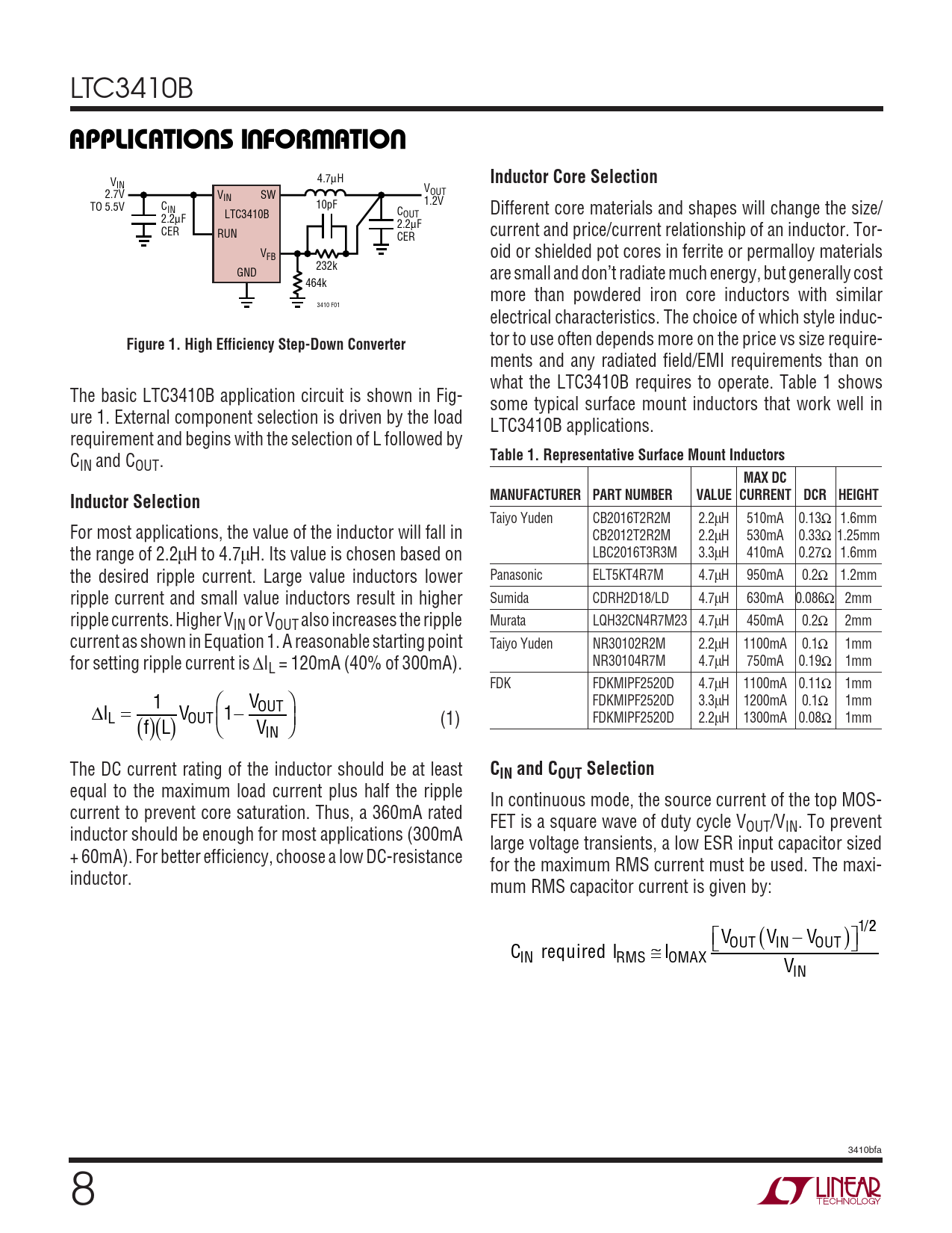 ments and any radiated field/EMI requirements than on what the LTC3410B requires to operate. Table 1 shows The basic LTC3410B application circuit is shown in Fig- some typical surface mount inductors that work well in ure 1. External component selection is driven by the load LTC3410B applications. requirement and begins with the selection of L followed by C
