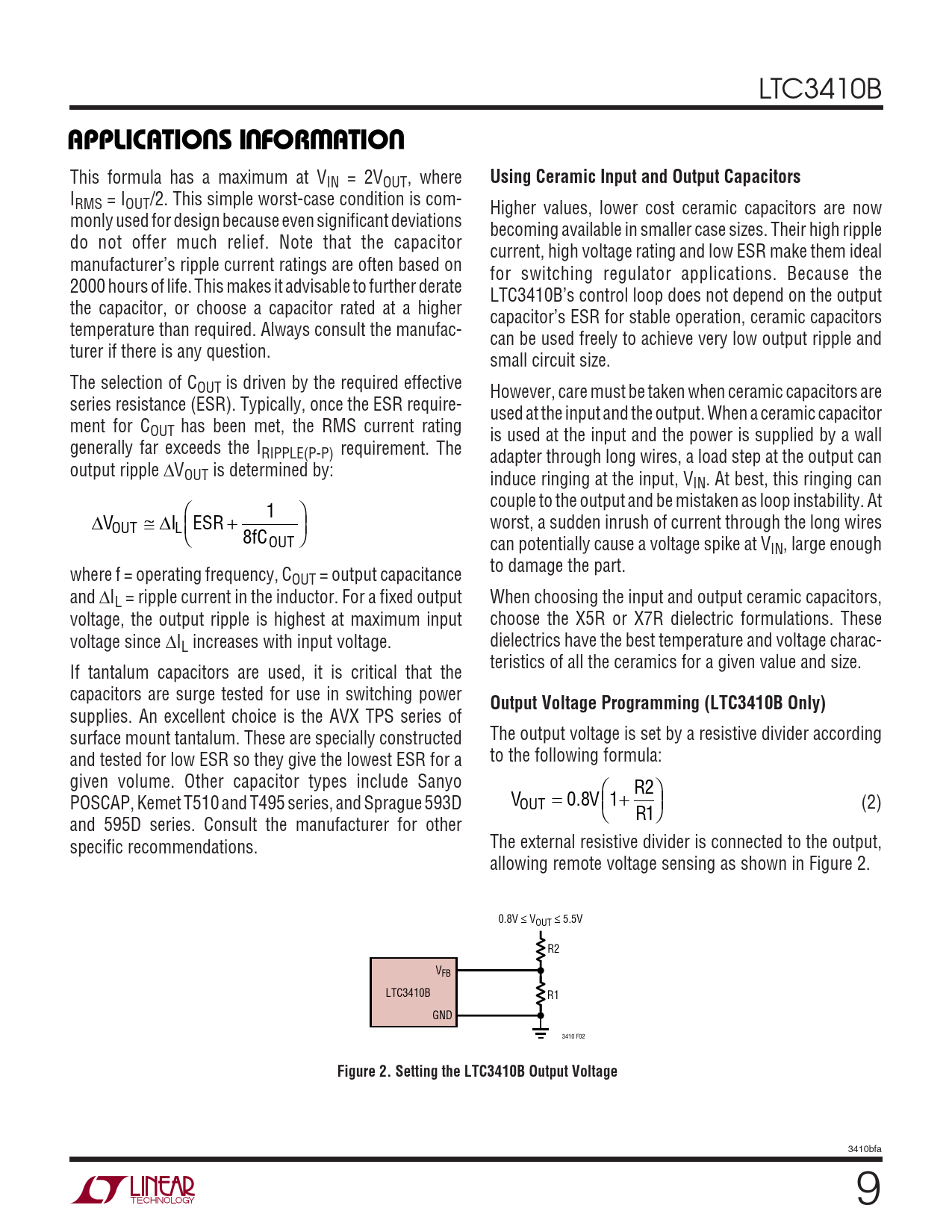 LTC3410B UUWUAPPLICATIO S I FOR ATIO This formula has a maximum at V Using Ceramic Input and Output Capacitors IN = 2VOUT, where IRMS = IOUT/2. This simple worst-case condition is com- Higher values, lower cost ceramic capacitors are now monly used for design because even significant deviations becoming available in smaller case sizes. Their high ripple do not offer much relief. Note that the capacitor current, high voltage rating and low ESR make them ideal manufacturer’s ripple current ratings are often based on for switching regulator applications. Because the 2000 hours of life. This makes it advisable to further derate LTC3410B’s control loop does not depend on the output the capacitor, or choose a capacitor rated at a higher capacitor’s ESR for stable operation, ceramic capacitors temperature than required. Always consult the manufac- can be used freely to achieve very low output ripple and turer if there is any question. small circuit size. The selection of COUT is driven by the required effective However, care must be taken when ceramic capacitors are series resistance (ESR). Typically, once the ESR require- used at the input and the output. When a ceramic capacitor ment for COUT has been met, the RMS current rating is used at the input and the power is supplied by a wall generally far exceeds the IRIPPLE(P-P) requirement. The adapter through long wires, a load step at the output can output ripple ∆VOUT is determined by: induce ringing at the input, VIN. At best, this ringing can couple to the output and be mistaken as loop instability. At ∆ 1 VOUT ≅ ∆ ⎛ I ESR L + ⎞ worst, a sudden inrush of current through the long wires ⎝⎜ fC 8 OUT ⎠⎟ can potentially cause a voltage spike at VIN, large enough to damage the part. where f = operating frequency, COUT = output capacitance and ∆I When choosing the input and output ceramic capacitors, L = ripple current in the inductor. For a fixed output voltage, the output ripple is highest at maximum input choose the X5R or X7R dielectric formulations. These voltage since ∆I dielectrics have the best temperature and voltage charac- L increases with input voltage. teristics of all the ceramics for a given value and size. If tantalum capacitors are used, it is critical that the capacitors are surge tested for use in switching power Output Voltage Programming (LTC3410B Only) supplies. An excellent choice is the AVX TPS series of The output voltage is set by a resistive divider according surface mount tantalum. These are specially constructed to the following formula: and tested for low ESR so they give the lowest ESR for a given volume. Other capacitor types include Sanyo ⎛ R2⎞ V 0. V POSCAP, Kemet T510 and T495 series, and Sprague 593D OUT = 8 1+ ⎝⎜ (2) R ⎠⎟ 1 and 595D series. Consult the manufacturer for other The external resistive divider is connected to the output, specific recommendations. allowing remote voltage sensing as shown in Figure 2. 0.8V ≤ VOUT ≤ 5.5V R2 VFB LTC3410B R1 GND 3410 F02 Figure 2. Setting the LTC3410B Output Voltage 3410bfa 9