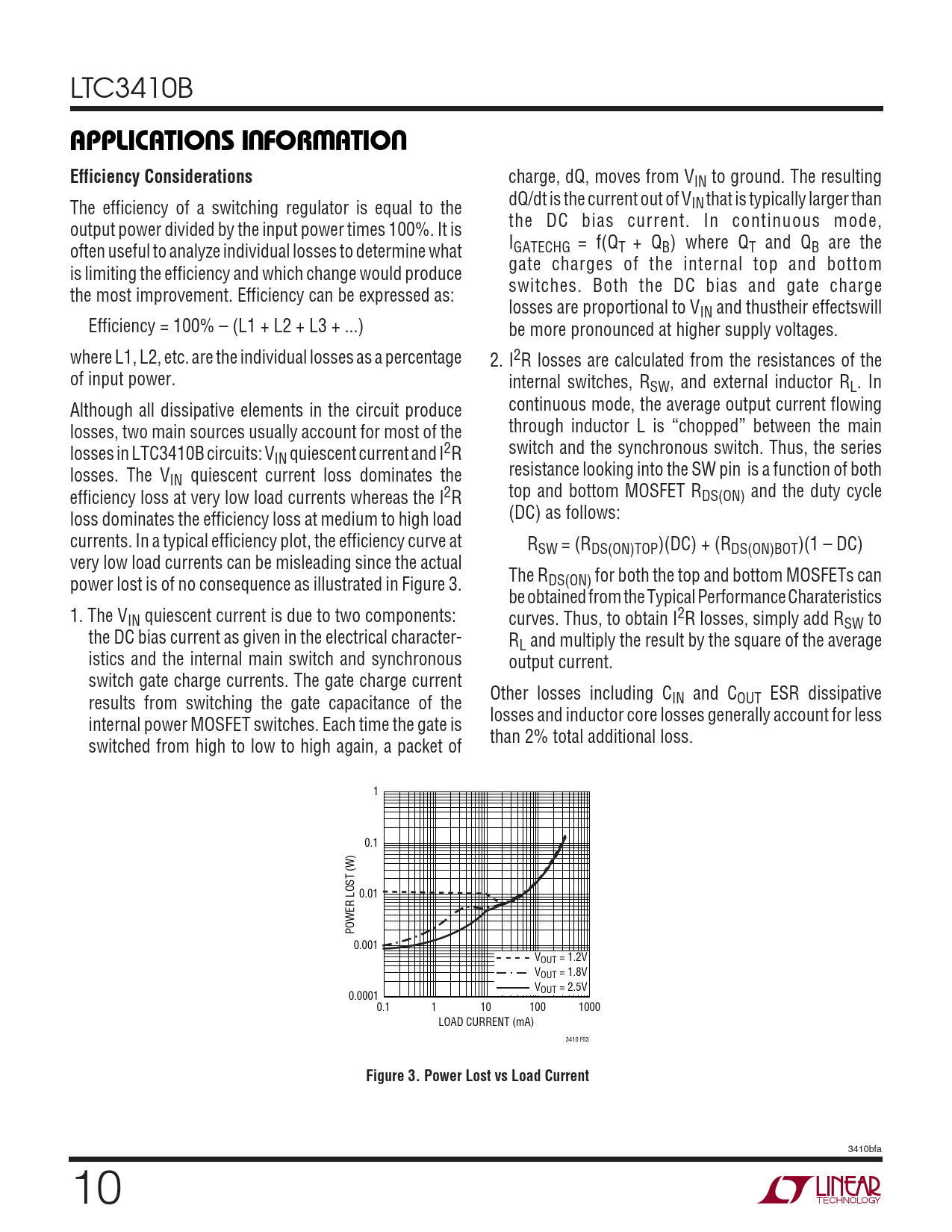 LTC3410B UUWUAPPLICATIO S I FOR ATIOEfficiency Considerations charge, dQ, moves from VIN to ground. The resulting dQ/dt is the current out of V The efficiency of a switching regulator is equal to the IN that is typically larger than the DC bias current. In continuous mode, output power divided by the input power times 100%. It is I often useful to analyze individual losses to determine what GATECHG = f(QT + QB) where QT and QB are the gate charges of the internal top and bottom is limiting the efficiency and which change would produce switches. Both the DC bias and gate charge the most improvement. Efficiency can be expressed as: losses are proportional to VIN and thustheir effectswill Efficiency = 100% – (L1 + L2 + L3 + ...) be more pronounced at higher supply voltages. where L1, L2, etc. are the individual losses as a percentage 2. I2R losses are calculated from the resistances of the of input power. internal switches, RSW, and external inductor RL. In Although all dissipative elements in the circuit produce continuous mode, the average output current flowing losses, two main sources usually account for most of the through inductor L is “chopped” between the main losses in LTC3410B circuits: V switch and the synchronous switch. Thus, the series IN quiescent current and I2R losses. The V resistance looking into the SW pin is a function of both IN quiescent current loss dominates the efficiency loss at very low load currents whereas the I2R top and bottom MOSFET RDS(ON) and the duty cycle loss dominates the efficiency loss at medium to high load (DC) as follows: currents. In a typical efficiency plot, the efficiency curve at RSW = (RDS(ON)TOP)(DC) + (RDS(ON)BOT)(1 – DC) very low load currents can be misleading since the actual The R power lost is of no consequence as illustrated in Figure 3. DS(ON) for both the top and bottom MOSFETs can be obtained from the Typical Performance Charateristics 1. The VIN quiescent current is due to two components: curves. Thus, to obtain I2R losses, simply add RSW to the DC bias current as given in the electrical character- RL and multiply the result by the square of the average istics and the internal main switch and synchronous output current. switch gate charge currents. The gate charge current Other losses including C results from switching the gate capacitance of the IN and COUT ESR dissipative losses and inductor core losses generally account for less internal power MOSFET switches. Each time the gate is than 2% total additional loss. switched from high to low to high again, a packet of 1 0.1 0.01 POWER LOST (W) 0.001 VOUT = 1.2V VOUT = 1.8V VOUT = 2.5V 0.0001 0.1 1 10 100 1000 LOAD CURRENT (mA) 3410 F03 Figure 3. Power Lost vs Load Current 3410bfa 10