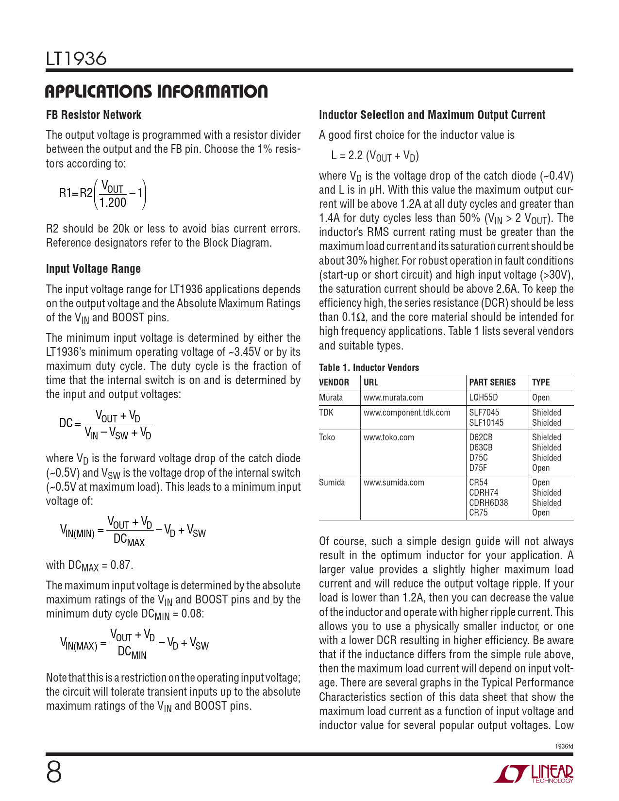 (start-up or short circuit) and high input voltage (>30V), The input voltage range for LT1936 applications depends the saturation current should be above 2.6A. To keep the on the output voltage and the Absolute Maximum Ratings effi ciency high, the series resistance (DCR) should be less of the VIN and BOOST pins. than 0.1Ω, and the core material should be intended for high frequency applications. Table 1 lists several vendors The minimum input voltage is determined by either the and suitable types. LT1936’s minimum operating voltage of ~3.45V or by its maximum duty cycle. The duty cycle is the fraction of