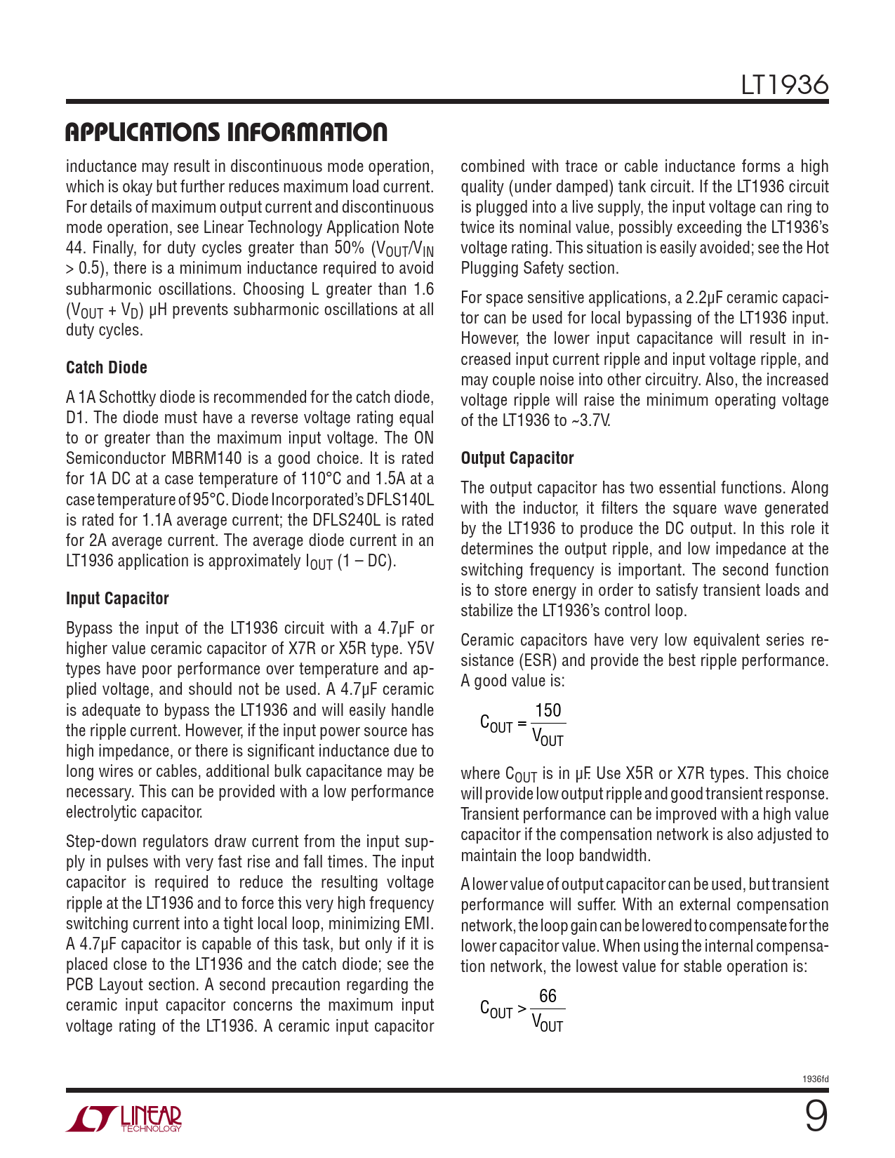 may couple noise into other circuitry. Also, the increased A 1A Schottky diode is recommended for the catch diode, voltage ripple will raise the minimum operating voltage D1. The diode must have a reverse voltage rating equal of the LT1936 to ~3.7V. to or greater than the maximum input voltage. The ON Semiconductor MBRM140 is a good choice. It is rated