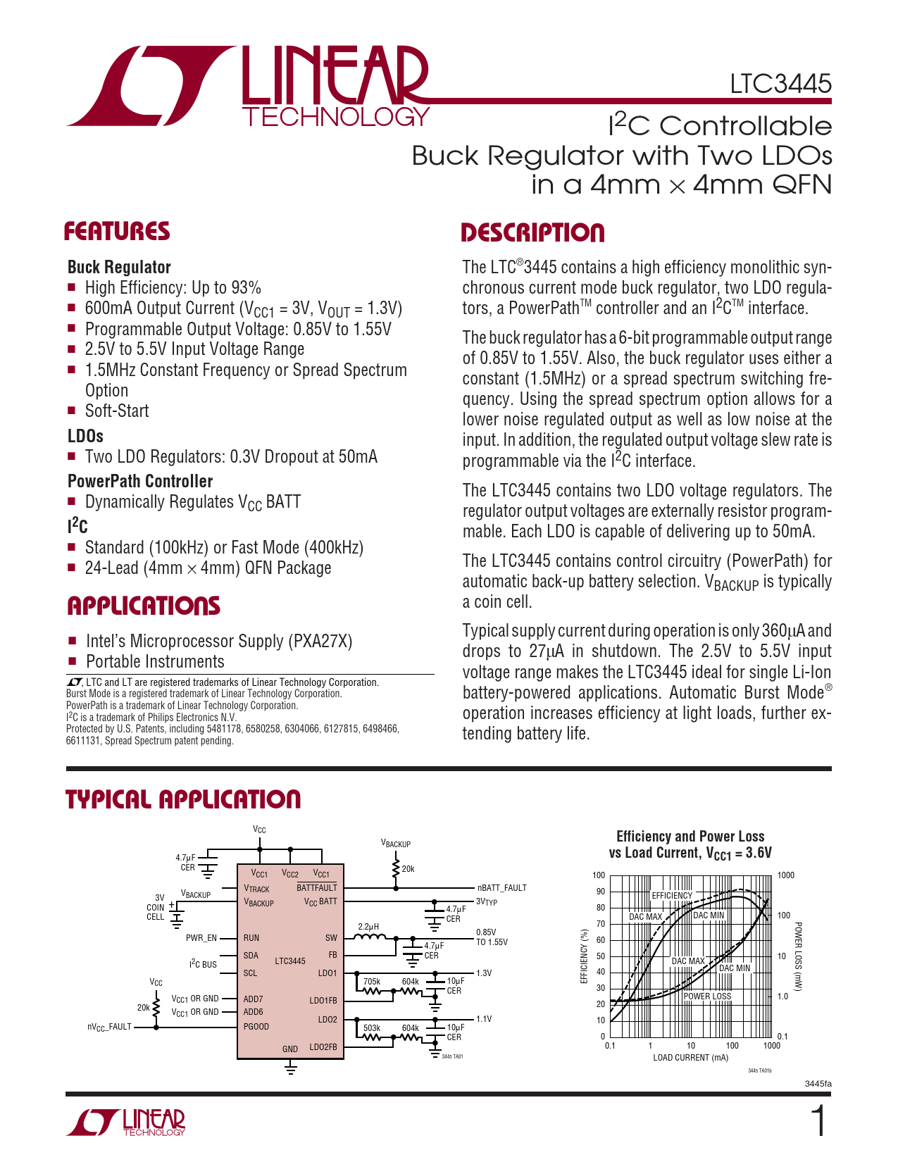 mable. Each LDO is capable of delivering up to 50mA. ■ Standard (100kHz) or Fast Mode (400kHz) ■ 24-Lead (4mm × 4mm) QFN Package The LTC3445 contains control circuitry (PowerPath) for automatic back-up battery selection. VBACKUP is typically