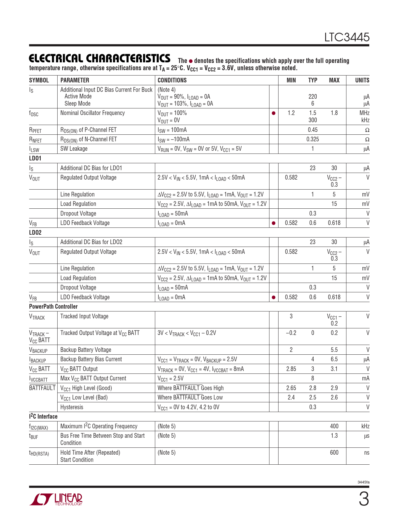 fI2C(MAX) Maximum I2C Operating Frequency (Note 5) 400 kHz tBUF Bus Free Time Between Stop and Start (Note 5) 1.3 µs Condition tHD(RSTA) Hold Time After (Repeated) (Note 5) 600 ns Start Condition 3445fa 3