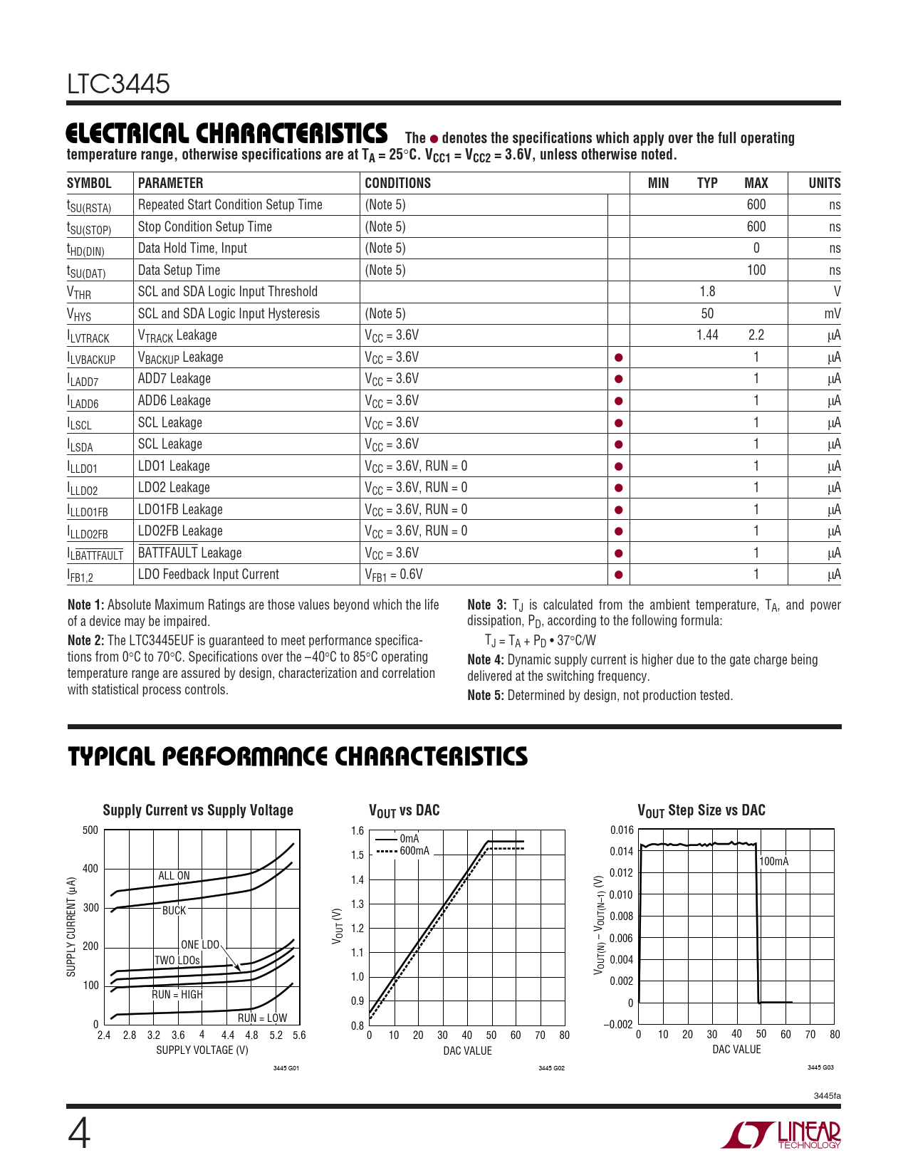 tSU(RSTA) Repeated Start Condition Setup Time (Note 5) 600 ns tSU(STOP) Stop Condition Setup Time (Note 5) 600 ns tHD(DIN) Data Hold Time, Input (Note 5) 0 ns tSU(DAT) Data Setup Time (Note 5) 100 ns VTHR SCL and SDA Logic Input Threshold 1.8 V VHYS SCL and SDA Logic Input Hysteresis (Note 5) 50 mV ILVTRACK VTRACK Leakage VCC = 3.6V 1.44 2.2 µA ILVBACKUP VBACKUP Leakage VCC = 3.6V ● 1 µA ILADD7 ADD7 Leakage VCC = 3.6V ● 1 µA ILADD6 ADD6 Leakage VCC = 3.6V ● 1 µA ILSCL SCL Leakage VCC = 3.6V ● 1 µA ILSDA SCL Leakage VCC = 3.6V ● 1 µA ILLDO1 LDO1 Leakage VCC = 3.6V, RUN = 0 ● 1 µA ILLDO2 LDO2 Leakage VCC = 3.6V, RUN = 0 ● 1 µA ILLDO1FB LDO1FB Leakage VCC = 3.6V, RUN = 0 ● 1 µA ILLDO2FB LDO2FB Leakage VCC = 3.6V, RUN = 0 ● 1 µA ILBATTFAULT BATTFAULT Leakage VCC = 3.6V ● 1 µA IFB1,2 LDO Feedback Input Current VFB1 = 0.6V ● 1 µA