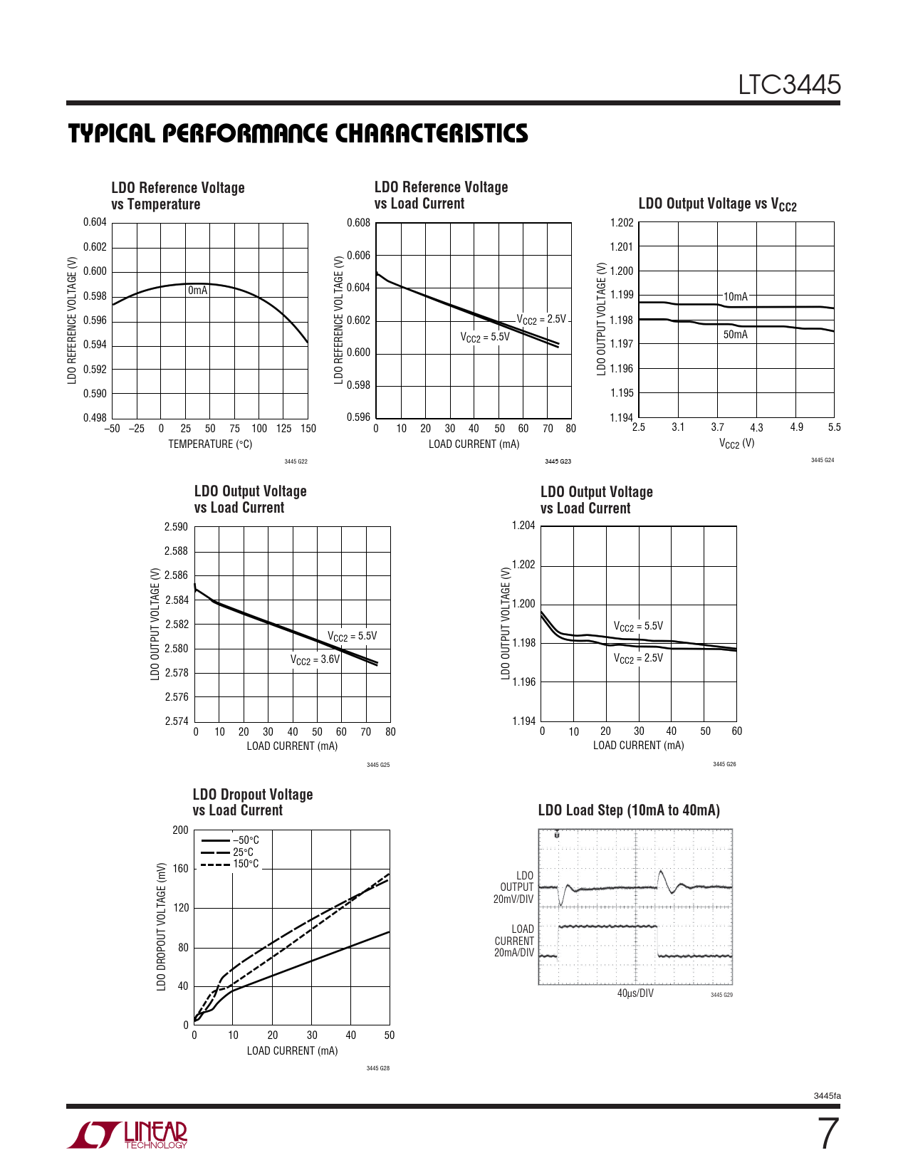 0.604 0.608 1.202 0.602 1.201 0.606 0.600 1.200 0mA 0.604 0.598 1.199 10mA 0.596 0.602 VCC2 = 2.5V 1.198 V 50mA CC2 = 5.5V 0.594 1.197 0.600 0.592 LDO OUTPUT VOLTAGE (V) 1.196 LDO REFERENCE VOLTAGE (V) LDO REFERENCE VOLTAGE (V) 0.598 0.590 1.195 0.498 0.596 1.194 –50 –25 0 25 50 75 100 125 150 0 10 20 30 40 50 60 70 80 2.5 3.1 3.7 4.3 4.9 5.5 TEMPERATURE (°C) LOAD CURRENT (mA) VCC2 (V) 3445 G22 3445 G23 3445 G24