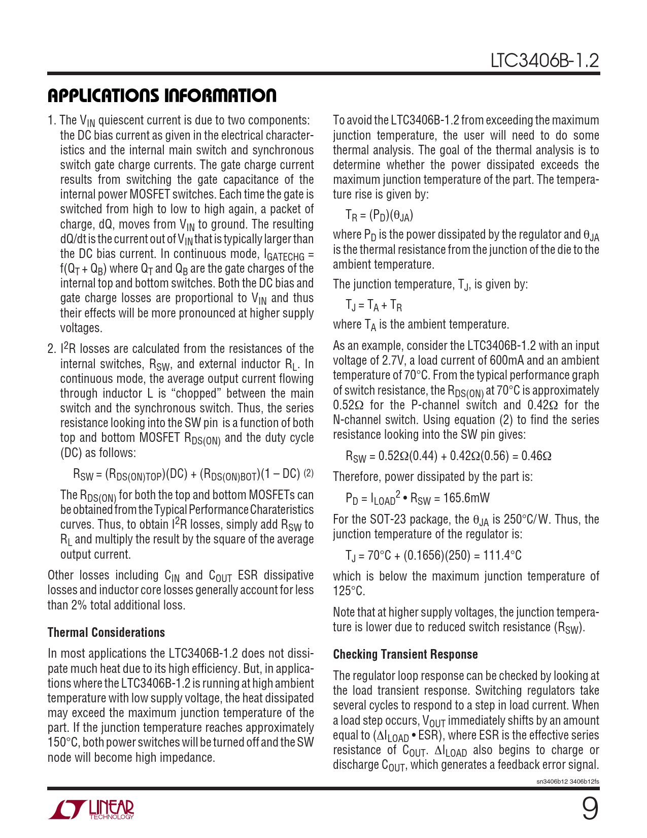 pate much heat due to its high efficiency. But, in applica- The regulator loop response can be checked by looking at tions where the LTC3406B-1.2 is running at high ambient the load transient response. Switching regulators take temperature with low supply voltage, the heat dissipated several cycles to respond to a step in load current. When may exceed the maximum junction temperature of the a load step occurs, V part. If the junction temperature reaches approximately OUT immediately shifts by an amount equal to (∆I 150°C, both power switches will be turned off and the SW LOAD • ESR), where ESR is the effective series resistance of C node will become high impedance. OUT. ∆ILOAD also begins to charge or discharge COUT, which generates a feedback error signal. sn3406b12 3406b12fs 9