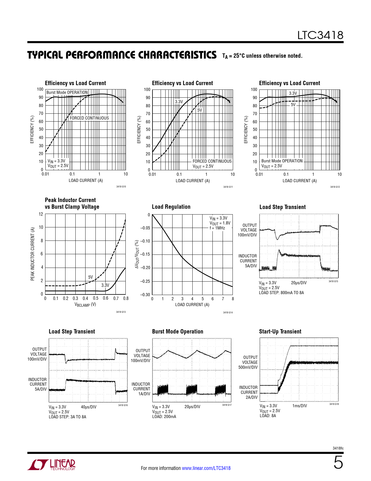 100 100 100 Burst Mode OPERATION 3.3V 90 90 90 3.3V 80 80 80 5V 5V 70 70 70 FORCED CONTINUOUS 60 60 60 50 50 50 40 40 40 EFFICIENCY (%) EFFICIENCY (%) EFFICIENCY (%) 30 30 30 20 20 20 10 VIN = 3.3V 10 FORCED CONTINUOUS 10 Burst Mode OPERATION VOUT = 2.5V V VOUT = 2.5V 0 0 OUT = 2.5V 0 0.01 0.1 1 10 0.01 0.1 1 10 0.01 0.1 1 10 LOAD CURRENT (A) LOAD CURRENT (A) LOAD CURRENT (A) 3418 G10 3418 G11 3418 G12