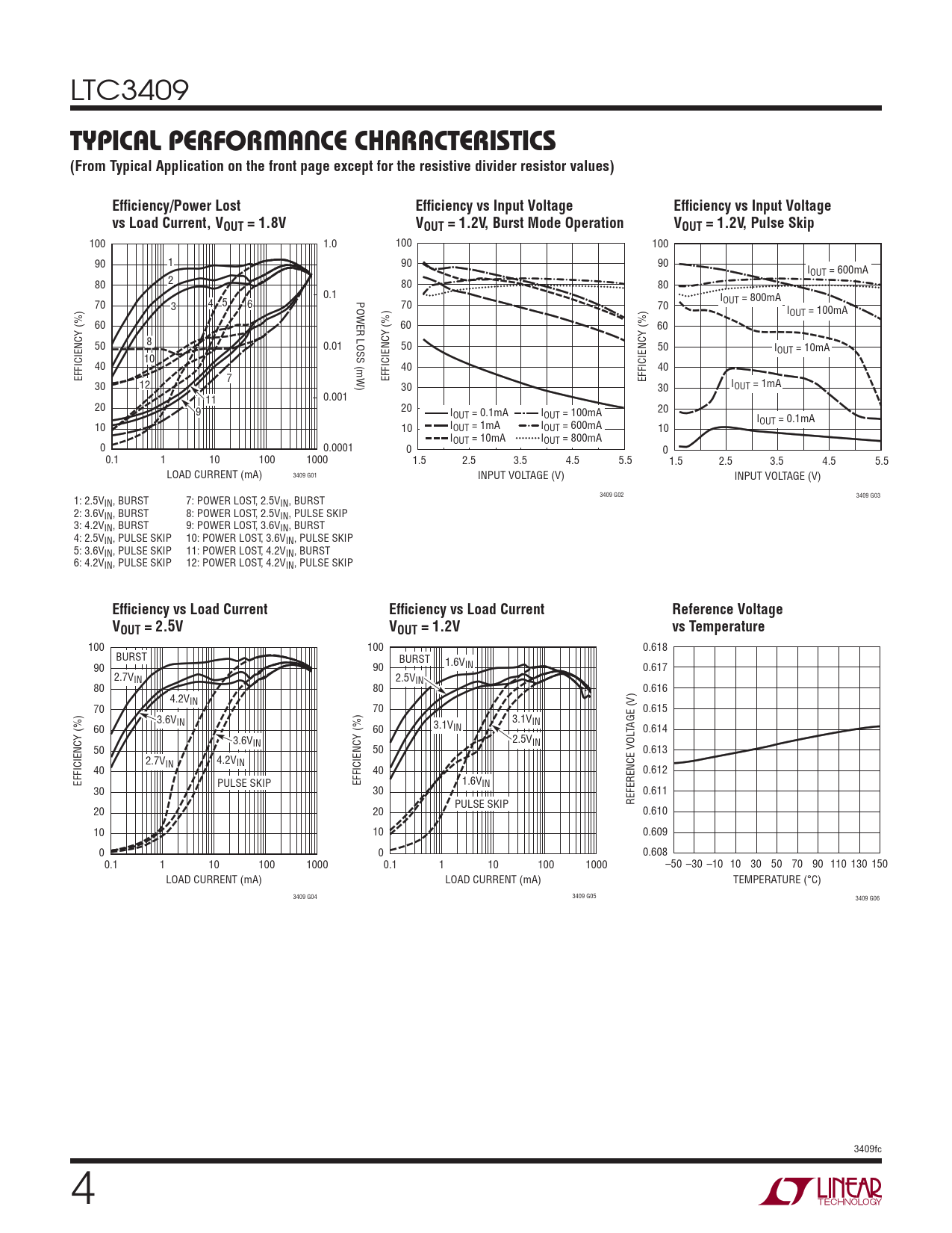 100 1.0 100 100 90 1 90 90 IOUT = 600mA 80 2 80 80 0.1 POWER LOSS (mW) I 70 OUT = 800mA 3 4 5 6 70 70 IOUT = 100mA 60 60 60 50 8 0.01 50 50 IOUT = 10mA 10 40 40 40 EFFICIENCY (%) 7 EFFICIENCY (%) EFFICIENCY (%) 30 12 30 30 IOUT = 1mA 11 0.001 20 9 20 I 20 OUT = 0.1mA IOUT = 100mA IOUT = 0.1mA 10 10 IOUT = 1mA IOUT = 600mA 10 IOUT = 10mA IOUT = 800mA 0 0.0001 0 0 0.1 1 10 100 1000 1.5 2.5 3.5 4.5 5.5 1.5 2.5 3.5 4.5 5.5 LOAD CURRENT (mA) 3409 G01 INPUT VOLTAGE (V) INPUT VOLTAGE (V) 3409 G02 3409 G03 1: 2.5VIN, BURST 7: POWER LOST, 2.5VIN, BURST 2: 3.6VIN, BURST 8: POWER LOST, 2.5VIN, PULSE SKIP 3: 4.2VIN, BURST 9: POWER LOST, 3.6VIN, BURST 4: 2.5VIN, PULSE SKIP 10: POWER LOST, 3.6VIN, PULSE SKIP 5: 3.6VIN, PULSE SKIP 11: POWER LOST, 4.2VIN, BURST 6: 4.2VIN, PULSE SKIP 12: POWER LOST, 4.2VIN, PULSE SKIP