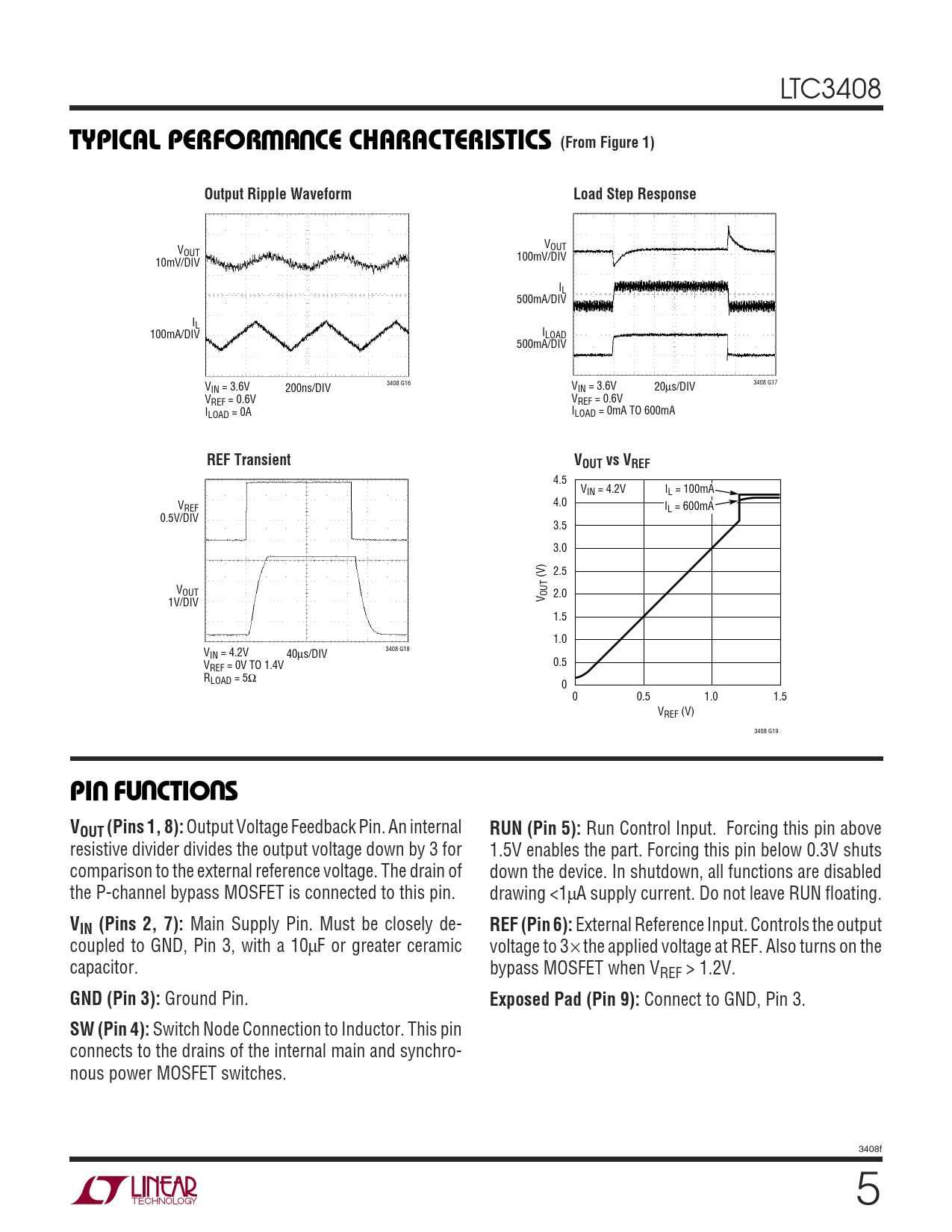 4.5 VIN = 4.2V IL = 100mA 4.0 VREF IL = 600mA 0.5V/DIV 3.5 3.0 2.5 (V) VOUT OUTV 2.0 1V/DIV 1.5 1.0 V 3408 G18 IN = 4.2V 40µs/DIV 0.5 VREF = 0V TO 1.4V RLOAD = 5Ω 0 0 0.5 1.0 1.5 VREF (V) 3408 G19