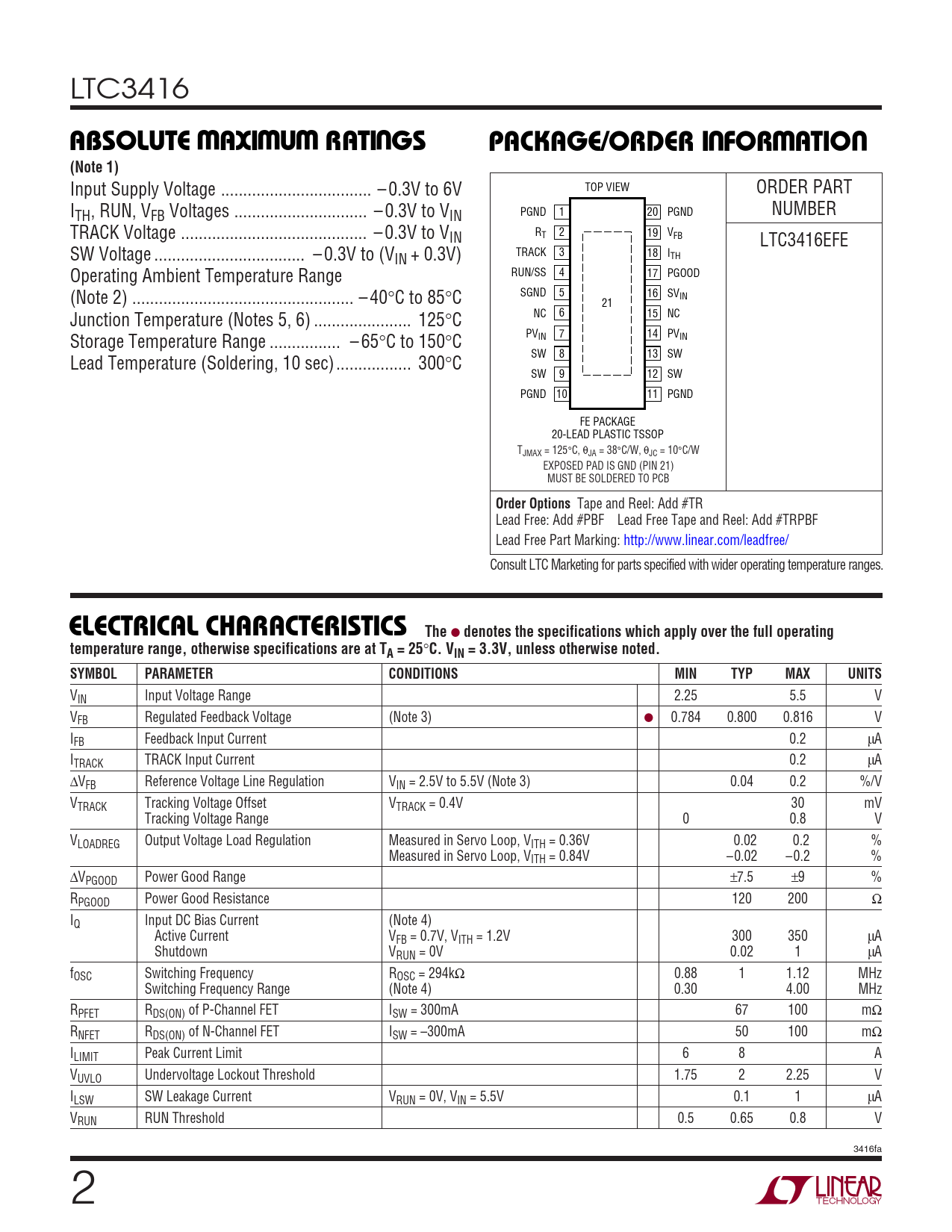 LTC3416 WWWUUWUABSOLUTE AXI U RATI GSPACKAGE/ORDER I FOR ATIO(Note 1) Input Supply Voltage .. – 0.3V to 6V TOP VIEW ORDER PART ITH, RUN, VFB Voltages .. – 0.3V to VIN PGND 1 20 PGND NUMBER TRACK Voltage .. – 0.3V to VIN R 2 19 T VFB LTC3416EFE SW Voltage .. – 0.3V to (V TRACK 3 IN + 0.3V) 18 ITH Operating Ambient Temperature Range RUN/SS 4 17 PGOOD (Note 2) .. – 40°C to 85°C SGND 5 16 SVIN 21 Junction Temperature (Notes 5, 6) .. 125°C NC 6 15 NC Storage Temperature Range .. – 65°C to 150°C PV 7 14 IN PVIN SW 8 13 SW Lead Temperature (Soldering, 10 sec)... 300°C SW 9 12 SW PGND 10 11 PGND FE PACKAGE 20-LEAD PLASTIC TSSOP TJMAX = 125°C, θJA = 38°C/W, θJC = 10°C/W EXPOSED PAD IS GND (PIN 21) MUST BE SOLDERED TO PCB Order Options Tape and Reel: Add #TR Lead Free: Add #PBF Lead Free Tape and Reel: Add #TRPBF Lead Free Part Marking: http://www.linear.com/leadfree/ Consult LTC Marketing for parts specified with wider operating temperature ranges. ELECTRICAL CHARACTERISTICS The ● denotes the specifications which apply over the full operatingtemperature range, otherwise specifications are at TA = 25 ° C. VIN = 3.3V, unless otherwise noted. SYMBOLPARAMETERCONDITIONSMINTYPMAXUNITS VIN Input Voltage Range 2.25 5.5 V VFB Regulated Feedback Voltage (Note 3) ● 0.784 0.800 0.816 V IFB Feedback Input Current 0.2 µA ITRACK TRACK Input Current 0.2 µA ∆VFB Reference Voltage Line Regulation VIN = 2.5V to 5.5V (Note 3) 0.04 0.2 %/V VTRACK Tracking Voltage Offset VTRACK = 0.4V 30 mV Tracking Voltage Range 0 0.8 V VLOADREG Output Voltage Load Regulation Measured in Servo Loop, VITH = 0.36V 0.02 0.2 % Measured in Servo Loop, VITH = 0.84V –0.02 –0.2 % ∆VPGOOD Power Good Range ±7.5 ±9 % RPGOOD Power Good Resistance 120 200 Ω IQ Input DC Bias Current (Note 4) Active Current VFB = 0.7V, VITH = 1.2V 300 350 µA Shutdown VRUN = 0V 0.02 1 µA fOSC Switching Frequency ROSC = 294kΩ 0.88 1 1.12 MHz Switching Frequency Range (Note 4) 0.30 4.00 MHz RPFET RDS(ON) of P-Channel FET ISW = 300mA 67 100 mΩ RNFET RDS(ON) of N-Channel FET ISW = –300mA 50 100 mΩ ILIMIT Peak Current Limit 6 8 A VUVLO Undervoltage Lockout Threshold 1.75 2 2.25 V ILSW SW Leakage Current VRUN = 0V, VIN = 5.5V 0.1 1 µA VRUN RUN Threshold 0.5 0.65 0.8 V 3416fa 2