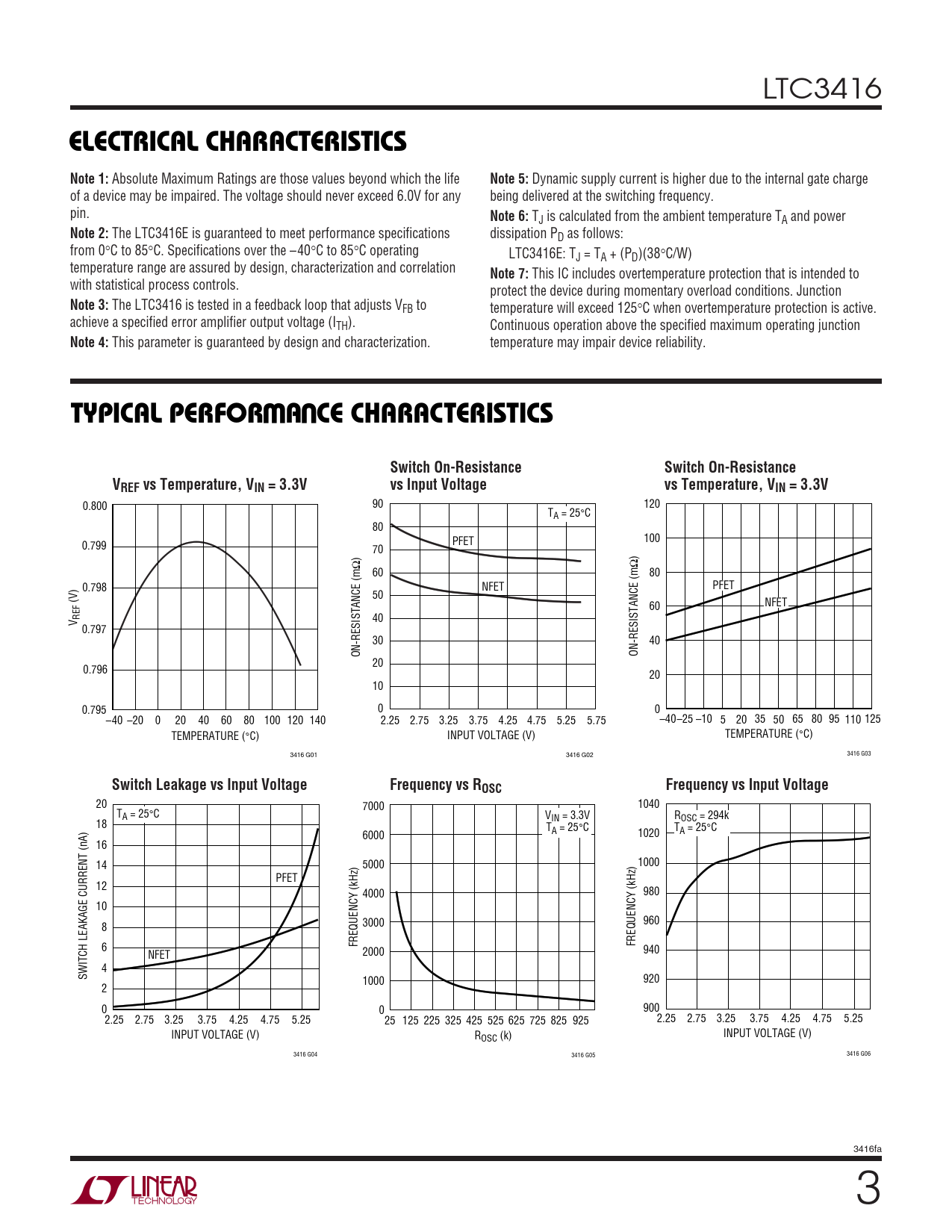 LTC3416 ELECTRICAL CHARACTERISTICSNote 1: Absolute Maximum Ratings are those values beyond which the life Note 5: Dynamic supply current is higher due to the internal gate charge of a device may be impaired. The voltage should never exceed 6.0V for any being delivered at the switching frequency. pin. Note 6: TJ is calculated from the ambient temperature TA and power Note 2: The LTC3416E is guaranteed to meet performance specifications dissipation PD as follows: from 0°C to 85°C. Specifications over the –40°C to 85°C operating LTC3416E: TJ = TA + (PD)(38°C/W) temperature range are assured by design, characterization and correlation Note 7: This IC includes overtemperature protection that is intended to with statistical process controls. protect the device during momentary overload conditions. Junction Note 3: The LTC3416 is tested in a feedback loop that adjusts VFB to temperature will exceed 125°C when overtemperature protection is active. achieve a specified error amplifier output voltage (ITH). Continuous operation above the specified maximum operating junction Note 4: This parameter is guaranteed by design and characterization. temperature may impair device reliability. WUTYPICAL PERFOR A CE CHARACTERISTICSSwitch On-ResistanceSwitch On-ResistanceVvs Input VoltageREF vs Temperature, VIN = 3.3Vvs Temperature, VIN = 3.3V 0.800 90 120 TA = 25°C 80 100 0.799 PFET 70 ) Ω Ω 60 80 0.798 NFET PFET 50 (V) 60 NFET REFV 40 0.797 30 40 ON-RESISTANCE (m ON-RESISTANCE (m 20 0.796 20 10 0.795 0 0 –40 –20 0 20 40 60 80 100 120 140 2.25 2.75 3.25 3.75 4.25 4.75 5.25 5.75 –40–25 –10 5 20 35 50 65 80 95 110 125 TEMPERATURE (°C) INPUT VOLTAGE (V) TEMPERATURE (°C) 3416 G01 3416 G02 3416 G03 Switch Leakage vs Input VoltageFrequency vs ROSCFrequency vs Input Voltage 20 7000 1040 TA = 25°C VIN = 3.3V ROSC = 294k 18 T T 6000 A = 25°C 1020 A = 25°C 16 14 5000 1000 PFET 12 4000 980 10 960 8 3000 FREQUENCY (kHz) 6 FREQUENCY (kHz) 940 NFET 2000 4 SWITCH LEAKAGE CURRENT (nA) 1000 920 2 0 0 900 2.25 2.75 3.25 3.75 4.25 4.75 5.25 25 125 225 325 425 525 625 725 825 925 2.25 2.75 3.25 3.75 4.25 4.75 5.25 INPUT VOLTAGE (V) R INPUT VOLTAGE (V) OSC (k) 3416 G04 3416 G05 3416 G06 3416fa 3