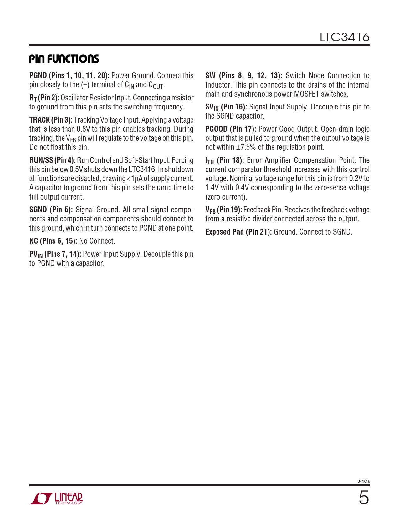 LTC3416 UUUPI FU CTIO SPGND (Pins 1, 10, 11, 20): Power Ground. Connect this SW (Pins 8, 9, 12, 13): Switch Node Connection to pin closely to the (–) terminal of CIN and COUT. Inductor. This pin connects to the drains of the internal main and synchronous power MOSFET switches. RT (Pin 2): Oscillator Resistor Input. Connecting a resistor to ground from this pin sets the switching frequency. SVIN (Pin 16): Signal Input Supply. Decouple this pin to the SGND capacitor. TRACK (Pin 3): Tracking Voltage Input. Applying a voltage that is less than 0.8V to this pin enables tracking. During PGOOD (Pin 17): Power Good Output. Open-drain logic tracking, the VFB pin will regulate to the voltage on this pin. output that is pulled to ground when the output voltage is Do not float this pin. not within ±7.5% of the regulation point. RUN/SS (Pin 4): Run Control and Soft-Start Input. Forcing ITH (Pin 18): Error Amplifier Compensation Point. The this pin below 0.5V shuts down the LTC3416. In shutdown current comparator threshold increases with this control all functions are disabled, drawing <1µA of supply current. voltage. Nominal voltage range for this pin is from 0.2V to A capacitor to ground from this pin sets the ramp time to 1.4V with 0.4V corresponding to the zero-sense voltage full output current. (zero current). SGND (Pin 5): Signal Ground. All small-signal compo- VFB (Pin 19): Feedback Pin. Receives the feedback voltage nents and compensation components should connect to from a resistive divider connected across the output. this ground, which in turn connects to PGND at one point. Exposed Pad (Pin 21): Ground. Connect to SGND. NC (Pins 6, 15): No Connect. PVIN (Pins 7, 14): Power Input Supply. Decouple this pin to PGND with a capacitor. 3416fa 5