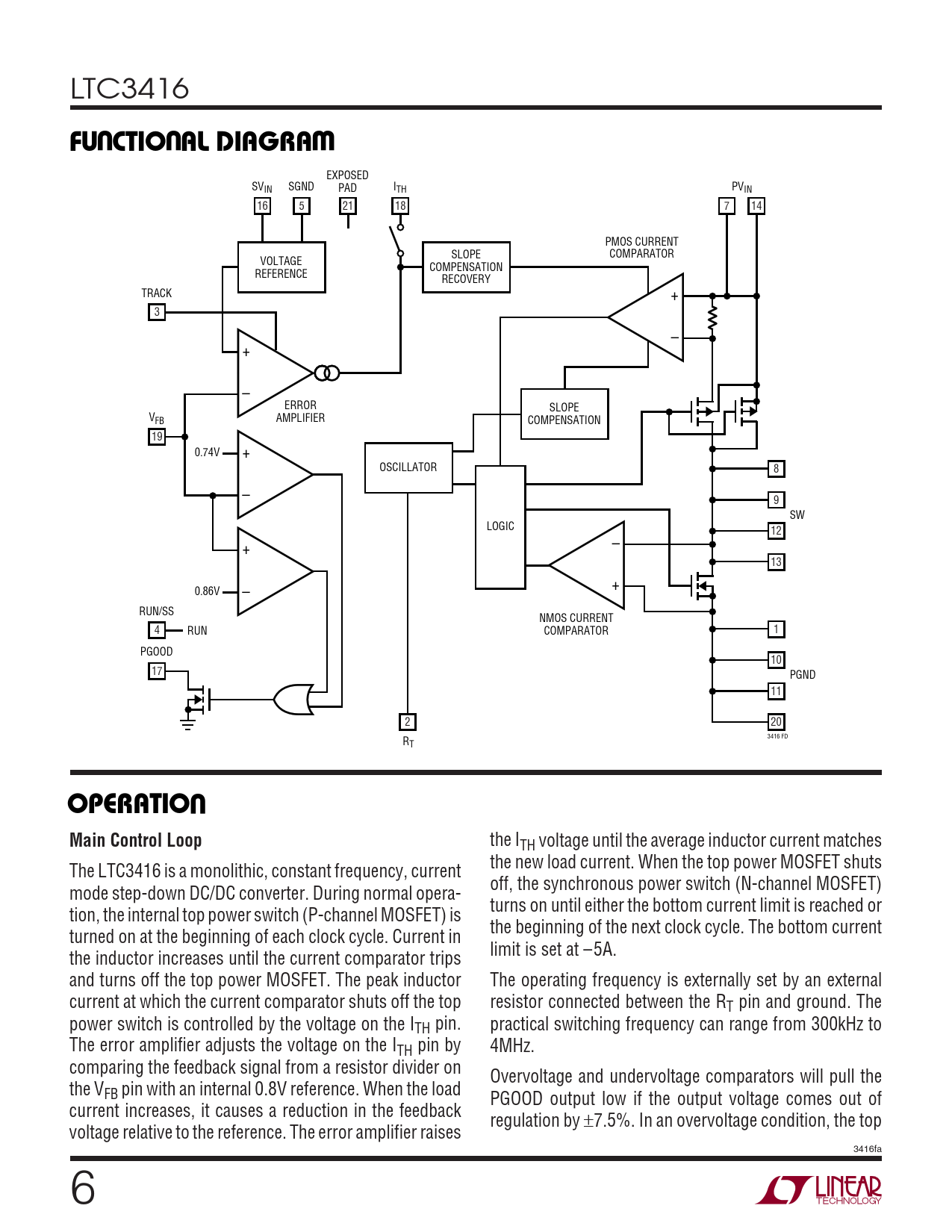 EXPOSED SVIN SGND PAD ITH PVIN 16 5 21 18 7 14 PMOS CURRENT SLOPE COMPARATOR VOLTAGE COMPENSATION REFERENCE RECOVERY TRACK + 3 – + – ERROR SLOPE V AMPLIFIER FB COMPENSATION 19 0.74V + OSCILLATOR 8 – 9 SW LOGIC 12 – + 13 + 0.86V – RUN/SS NMOS CURRENT 4 RUN COMPARATOR 1 PGOOD 10 17 PGND 11 2 20 3416 FD RT