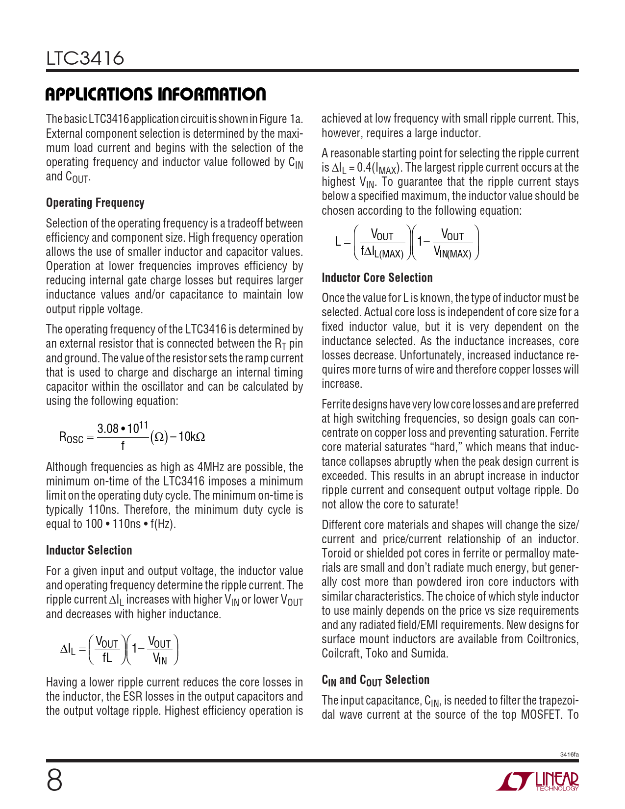 LTC3416 UUWUAPPLICATIO S I FOR ATIO The basic LTC3416 application circuit is shown in Figure 1a. achieved at low frequency with small ripple current. This, External component selection is determined by the maxi- however, requires a large inductor. mum load current and begins with the selection of the A reasonable starting point for selecting the ripple current operating frequency and inductor value followed by CIN is ∆I and C L = 0.4(IMAX). The largest ripple current occurs at the OUT. highest VIN. To guarantee that the ripple current stays below a specified maximum, the inductor value should be Operating Frequency chosen according to the following equation: Selection of the operating frequency is a tradeoff between ⎛ ⎞⎛ ⎞ efficiency and component size. High frequency operation V V L OUT OUT = 1– allows the use of smaller inductor and capacitor values. ⎝⎜ f∆I ⎠⎟⎝⎜ V L MAX IN MAX ⎠⎟ ( ) ( ) Operation at lower frequencies improves efficiency by reducing internal gate charge losses but requires larger Inductor Core Selection inductance values and/or capacitance to maintain low Once the value for L is known, the type of inductor must be output ripple voltage. selected. Actual core loss is independent of core size for a The operating frequency of the LTC3416 is determined by fixed inductor value, but it is very dependent on the an external resistor that is connected between the R inductance selected. As the inductance increases, core T pin and ground. The value of the resistor sets the ramp current losses decrease. Unfortunately, increased inductance re- that is used to charge and discharge an internal timing quires more turns of wire and therefore copper losses will capacitor within the oscillator and can be calculated by increase. using the following equation: Ferrite designs have very low core losses and are preferred at high switching frequencies, so design goals can con- 3 08 1011 . • R ( )– k centrate on copper loss and preventing saturation. Ferrite OSC = Ω 10 Ω f core material saturates “hard,” which means that induc- Although frequencies as high as 4MHz are possible, the tance collapses abruptly when the peak design current is minimum on-time of the LTC3416 imposes a minimum exceeded. This results in an abrupt increase in inductor limit on the operating duty cycle. The minimum on-time is ripple current and consequent output voltage ripple. Do typically 110ns. Therefore, the minimum duty cycle is not allow the core to saturate! equal to 100 • 110ns • f(Hz). Different core materials and shapes will change the size/ current and price/current relationship of an inductor. Inductor Selection Toroid or shielded pot cores in ferrite or permalloy mate- For a given input and output voltage, the inductor value rials are small and don’t radiate much energy, but gener- and operating frequency determine the ripple current. The ally cost more than powdered iron core inductors with ripple current ∆I similar characteristics. The choice of which style inductor L increases with higher VIN or lower VOUT and decreases with higher inductance. to use mainly depends on the price vs size requirements and any radiated field/EMI requirements. New designs for surface mount inductors are available from Coiltronics, ∆ V V I OUT OUT L = ⎛ ⎞⎛ ⎞ ⎝⎜ 1– fL ⎠⎟ ⎝⎜ V Coilcraft, Toko and Sumida. IN ⎠ ⎟ Having a lower ripple current reduces the core losses in CIN and COUT Selection the inductor, the ESR losses in the output capacitors and The input capacitance, CIN, is needed to filter the trapezoi- the output voltage ripple. Highest efficiency operation is dal wave current at the source of the top MOSFET. To 3416fa 8