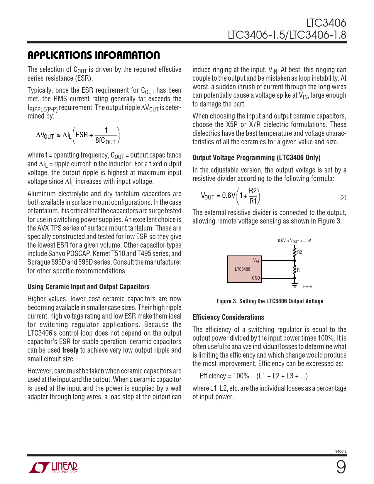 APPLICATIO S I FOR ATIO. Output Voltage Programming (LTC3406 Only). Using Ceramic Input and Output Capacitors