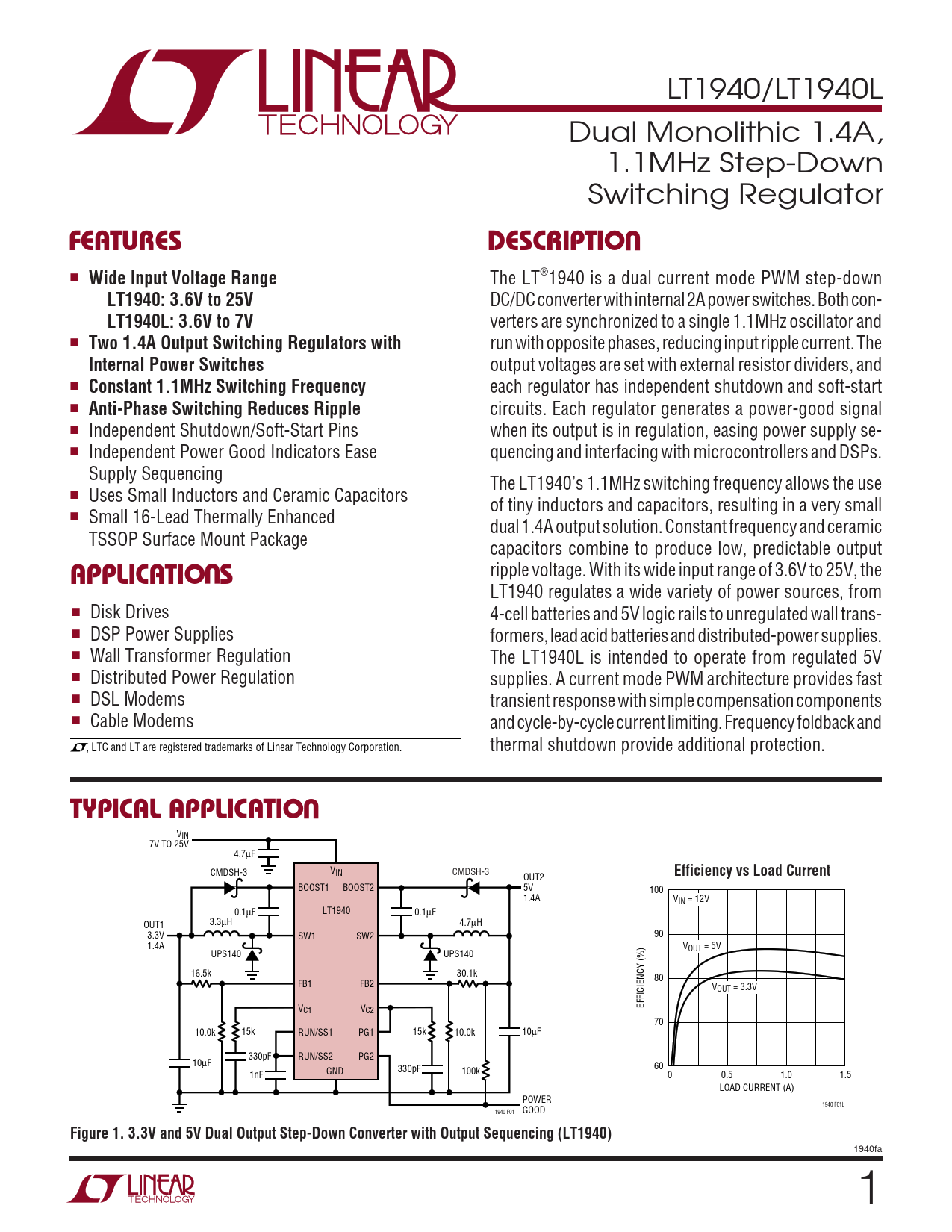 LT1940/LT1940L Dual Monolithic 1.4A, 1.1MHz Step-Down Switching Regulator UFEATURESDESCRIPTIO ■ Wide Input Voltage Range The LT®1940 is a dual current mode PWM step-down LT1940: 3.6V to 25V DC/DC converter with internal 2A power switches. Both con- LT1940L: 3.6V to 7V verters are synchronized to a single 1.1MHz oscillator and ■ Two 1.4A Output Switching Regulators with run with opposite phases, reducing input ripple current. The Internal Power Switches output voltages are set with external resistor dividers, and ■ Constant 1.1MHz Switching Frequency each regulator has independent shutdown and soft-start ■ Anti-Phase Switching Reduces Ripple circuits. Each regulator generates a power-good signal ■ Independent Shutdown/Soft-Start Pins when its output is in regulation, easing power supply se- ■ Independent Power Good Indicators Ease quencing and interfacing with microcontrollers and DSPs. Supply Sequencing The LT1940’s 1.1MHz switching frequency allows the use ■ Uses Small Inductors and Ceramic Capacitors of tiny inductors and capacitors, resulting in a very small ■ Small 16-Lead Thermally Enhanced dual 1.4A output solution. Constant frequency and ceramic TSSOP Surface Mount Package U capacitors combine to produce low, predictable output APPLICATIO S ripple voltage. With its wide input range of 3.6V to 25V, the LT1940 regulates a wide variety of power sources, from ■ Disk Drives 4-cell batteries and 5V logic rails to unregulated wall trans- ■ DSP Power Supplies formers, lead acid batteries and distributed-power supplies. ■ Wall Transformer Regulation The LT1940L is intended to operate from regulated 5V ■ Distributed Power Regulation supplies. A current mode PWM architecture provides fast ■ DSL Modems transient response with simple compensation components ■ Cable Modems and cycle-by-cycle current limiting. Frequency foldback and , LTC and LT are registered trademarks of Linear Technology Corporation. thermal shutdown provide additional protection. UTYPICAL APPLICATIO VIN 7V TO 25V 4.7µF V CMDSH-3 IN CMDSH-3 Efficiency vs Load Current OUT2 BOOST1 BOOST2 5V 100 1.4A VIN = 12V 0.1µF LT1940 0.1µF 3.3 OUT1 µH 4.7µH 3.3V SW1 SW2 90 1.4A VOUT = 5V UPS140 UPS140 16.5k 30.1k 80 FB1 FB2 VOUT = 3.3V V EFFICIENCY (%) C1 VC2 70 10.0k 15k RUN/SS1 PG1 15k 10.0k 10µF 330pF RUN/SS2 PG2 10µF 60 GND 330pF 100k 1nF 0 0.5 1.0 1.5 LOAD CURRENT (A) POWER 1940 F01b 1940 F01 GOOD Figure 1. 3.3V and 5V Dual Output Step-Down Converter with Output Sequencing (LT1940) 1940fa 1