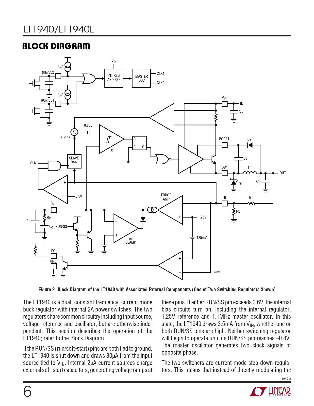 VIN 2µA RUN/SS2 CLK1 INT REG MASTER AND REF OSC CLK2 2µA VIN RUN/SS1 IN CIN 0.75V ∑ SLOPE R BOOST D2 S Q C1 SLAVE C3 OSC CLK SW L1 OUT + C1 D1 – ERROR 0.5V FB AMP – R1 VC R2 + RC – 1.25V CF C RUN/SS C + I 125mV LIMIT CLAMP PG + GND – 1940 F02
