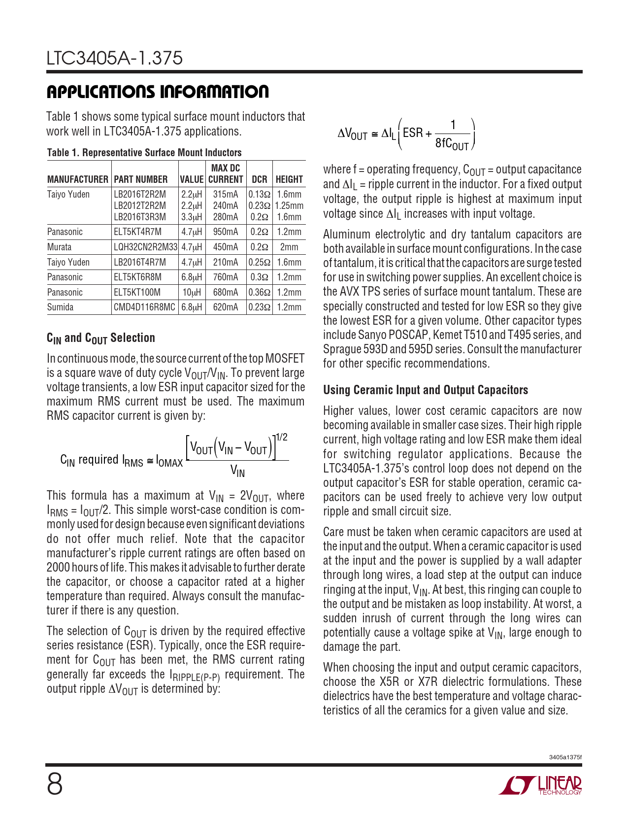 Table 1 shows some typical surface mount inductors that ⎛ 1 ⎞ work well in LTC3405A-1.375 applications. ∆VOUT ≅ ∆I ESR L + ⎜ ⎟ ⎝ 8fCOUT ⎠