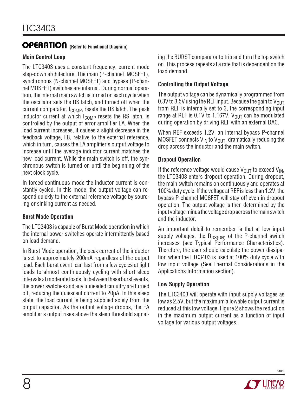 chronous switch is turned on until the beginning of the If the reference voltage would cause V next clock cycle. OUT to exceed VIN, the LTC3403 enters dropout operation. During dropout, In forced continuous mode the inductor current is con- the main switch remains on continuously and operates at stantly cycled. In this mode, the output voltage can re- 100% duty cycle. If the voltage at REF is less than 1.2V, the spond quickly to the external reference voltage by sourc- bypass P-channel MOSFET will stay off even in dropout ing or sinking current as needed. operation. The output voltage is then determined by the input voltage minus the voltage drop across the main switch