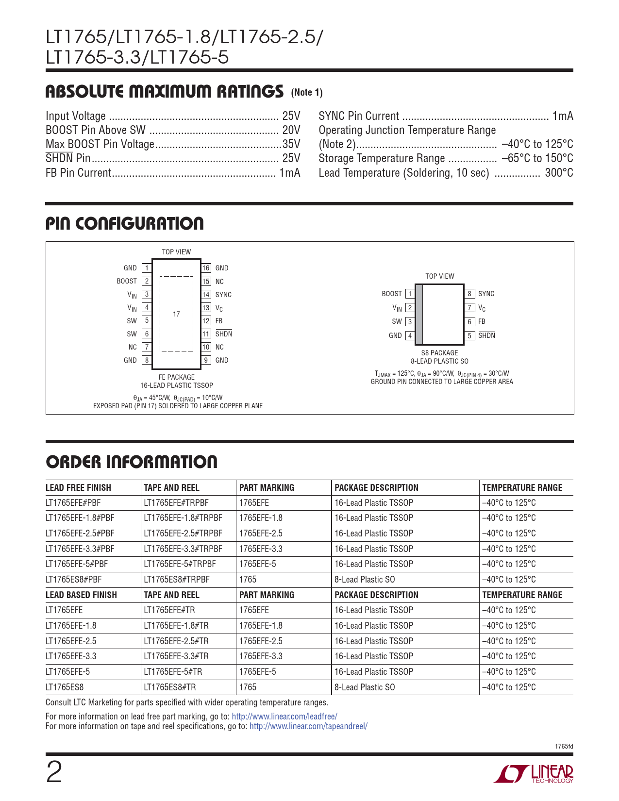 LT1765EFE LT1765EFE#TR 1765EFE 16-Lead Plastic TSSOP –40°C to 125°C LT1765EFE-1.8 LT1765EFE-1.8#TR 1765EFE-1.8 16-Lead Plastic TSSOP –40°C to 125°C LT1765EFE-2.5 LT1765EFE-2.5#TR 1765EFE-2.5 16-Lead Plastic TSSOP –40°C to 125°C LT1765EFE-3.3 LT1765EFE-3.3#TR 1765EFE-3.3 16-Lead Plastic TSSOP –40°C to 125°C LT1765EFE-5 LT1765EFE-5#TR 1765EFE-5 16-Lead Plastic TSSOP –40°C to 125°C LT1765ES8 LT1765ES8#TR 1765 8-Lead Plastic SO –40°C to 125°C Consult LTC Marketing for parts specifi ed with wider operating temperature ranges. For more information on lead free part marking, go to: http://www.linear.com/leadfree/ For more information on tape and reel specifi cations, go to: http://www.linear.com/tapeandreel/ 1765fd 2