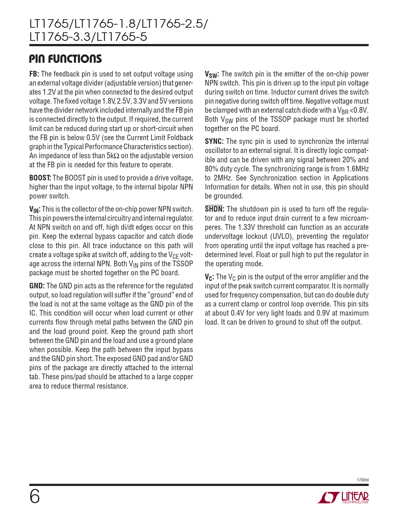 PIN FUNCTIONS. FB:. VSW:. SYNC:. BOOST:. VIN:. SHDN:. VC:. GND: