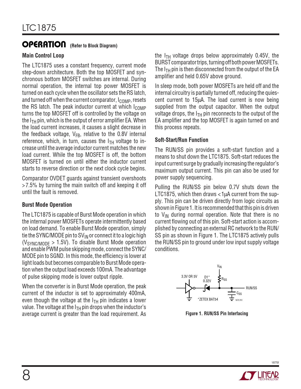 LTC1875 UOPERATIO(Refer to Block Diagram)Main Control Loop the ITH voltage drops below approximately 0.45V, the BURST comparator trips, turning off both power MOSFETs. The LTC1875 uses a constant frequency, current mode The I step-down architecture. Both the top MOSFET and syn- TH pin is then disconnected from the output of the EA amplifier and held 0.65V above ground. chronous bottom MOSFET switches are internal. During normal operation, the internal top power MOSFET is In sleep mode, both power MOSFETs are held off and the turned on each cycle when the oscillator sets the RS latch, internal circuitry is partially turned off, reducing the quies- and turned off when the current comparator, ICOMP, resets cent current to 15µA. The load current is now being the RS latch. The peak inductor current at which ICOMP supplied from the output capacitor. When the output turns the top MOSFET off is controlled by the voltage on voltage drops, the ITH pin reconnects to the output of the the ITH pin, which is the output of error amplifier EA. When EA amplifier and the top MOSFET is again turned on and the load current increases, it causes a slight decrease in this process repeats. the feedback voltage, VFB, relative to the 0.8V internal reference, which, in turn, causes the I Soft-Start/Run Function TH voltage to in- crease until the average inductor current matches the new The RUN/SS pin provides a soft-start function and a load current. While the top MOSFET is off, the bottom means to shut down the LTC1875. Soft-start reduces the MOSFET is turned on until either the inductor current input current surge by gradually increasing the regulator’s starts to reverse direction or the next clock cycle begins. maximum output current. This pin can also be used for Comparator OVDET guards against transient overshoots power supply sequencing. > 7.5% by turning the main switch off and keeping it off Pulling the RUN/SS pin below 0.7V shuts down the until the fault is removed. LTC1875, which then draws < 1µA current from the sup- ply. This pin can be driven directly from logic circuits as Burst Mode Operation shown in Figure 1. It is recommended that this pin is driven The LTC1875 is capable of Burst Mode operation in which to VIN during normal operation. Note that there is no the internal power MOSFETs operate intermittently based current flowing out of this pin. Soft-start action is accom- on load demand. To enable Burst Mode operation, simply plished by connecting an external RC network to the RUN/ tie the SYNC/MODE pin to SVIN or connect it to a logic high SS pin as shown in Figure 1. The LTC1875 actively pulls (VSYNC/MODE > 1.5V). To disable Burst Mode operation the RUN/SS pin to ground under low input supply voltage and enable PWM pulse skipping mode, connect the SYNC/ conditions. MODE pin to SGND. In this mode, the efficiency is lower at light loads but becomes comparable to Burst Mode opera- V tion when the output load exceeds 100mA. The advantage IN of pulse skipping mode is lower output ripple. 3.3V OR 5V D1* R 0.32V SS When the converter is in Burst Mode operation, the peak RUN/SS current of the inductor is set to approximately 400mA, CSS even though the voltage at the I *ZETEX BAT54 TH pin indicates a lower 1875 F01 value. The voltage at the ITH pin drops when the inductor’s average current is greater than the load requirement. As Figure 1. RUN/SS Pin Interfacing 1875f 8