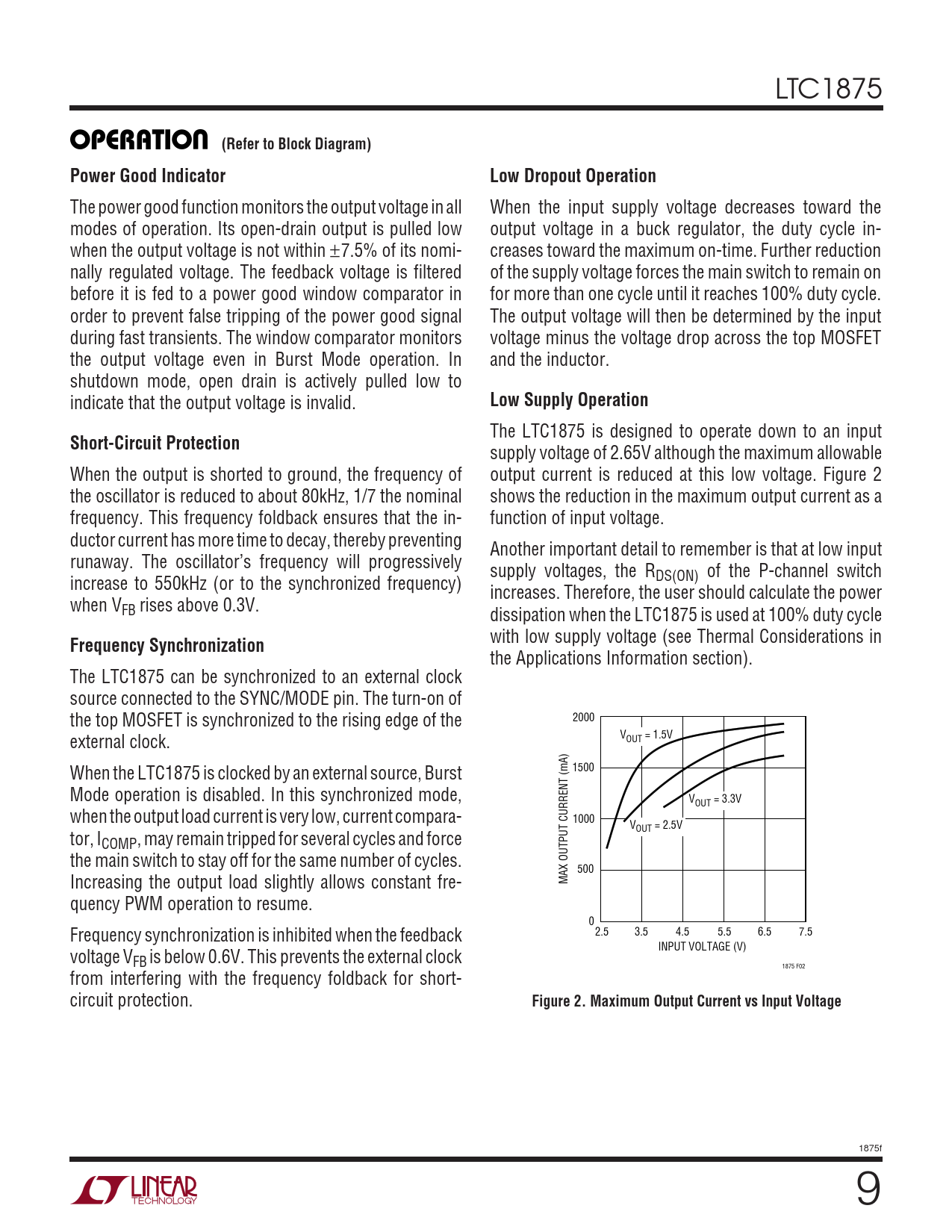the Applications Information section). The LTC1875 can be synchronized to an external clock source connected to the SYNC/MODE pin. The turn-on of the top MOSFET is synchronized to the rising edge of the 2000 external clock. VOUT = 1.5V When the LTC1875 is clocked by an external source, Burst 1500 Mode operation is disabled. In this synchronized mode, VOUT = 3.3V when the output load current is very low, current compara- 1000 VOUT = 2.5V tor, ICOMP, may remain tripped for several cycles and force the main switch to stay off for the same number of cycles. 500 Increasing the output load slightly allows constant fre- MAX OUTPUT CURRENT (mA) quency PWM operation to resume. 0 Frequency synchronization is inhibited when the feedback 2.5 3.5 4.5 5.5 6.5 7.5 INPUT VOLTAGE (V) voltage VFB is below 0.6V. This prevents the external clock 1875 F02 from interfering with the frequency foldback for short- circuit protection.