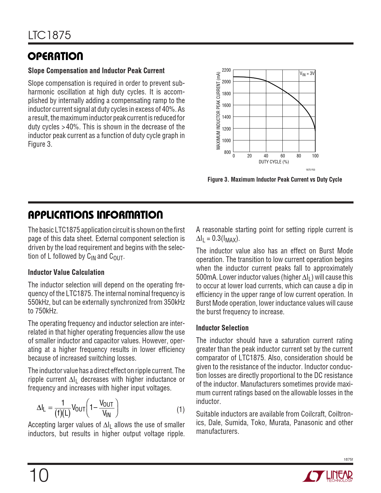 2200 VIN = 3V Slope compensation is required in order to prevent sub- 2000 harmonic oscillation at high duty cycles. It is accom- 1800 plished by internally adding a compensating ramp to the 1600 inductor current signal at duty cycles in excess of 40%. As a result, the maximum inductor peak current is reduced for 1400 duty cycles > 40%. This is shown in the decrease of the 1200 inductor peak current as a function of duty cycle graph in 1000 Figure 3. MAXIMUM INDUCTOR PEAK CURRENT (mA) 800 0 20 40 60 80 100 DUTY CYCLE (%) 1875 F03