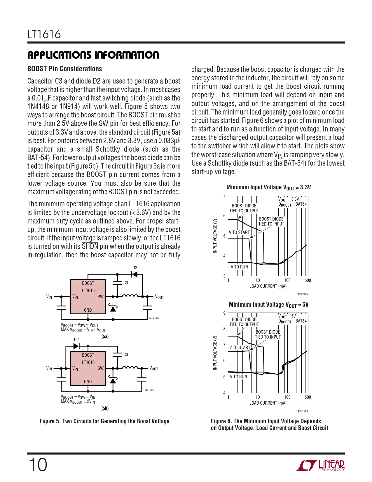 TIED TO INPUT D2 7 V TO START BOOST C3 LT1616 6 VIN VIN SW VOUT INPUT VOLTAGE (V) 5 V TO RUN GND 1616 F05b 4 VBOOST – VSW ≅ VIN 1 10 100 500 MAX VBOOST ≅ 2VIN LOAD CURRENT (mA)
