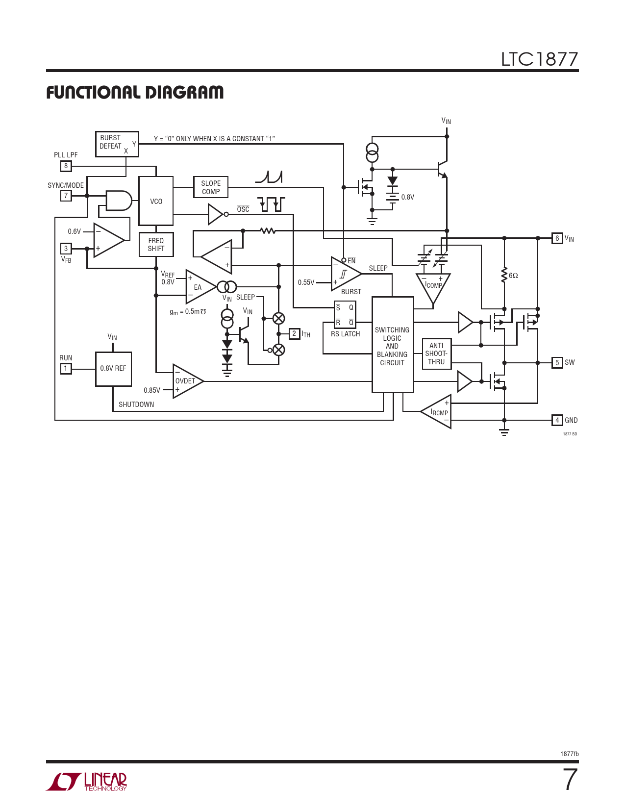 VIN BURST Y = “0” ONLY WHEN X IS A CONSTANT “1” Y DEFEAT X PLL LPF 8 SLOPE SYNC/MODE COMP 7 0.8V VCO OSC 0.6V – FREQ 6 VIN 3 + SHIFT – VFB EN + – SLEEP V + REF 6Ω 0.8V 0.55V + – + I – EA COMP BURST VIN SLEEP 7 S Q gm = 0.5m VIN R Q SWITCHING V 2 ITH RS LATCH IN LOGIC AND ANTI SHOOT- RUN BLANKING CIRCUIT THRU 5 SW 1 0.8V REF – OVDET 0.85V + + SHUTDOWN IRCMP– 4 GND 1877 BD 1877fb 7