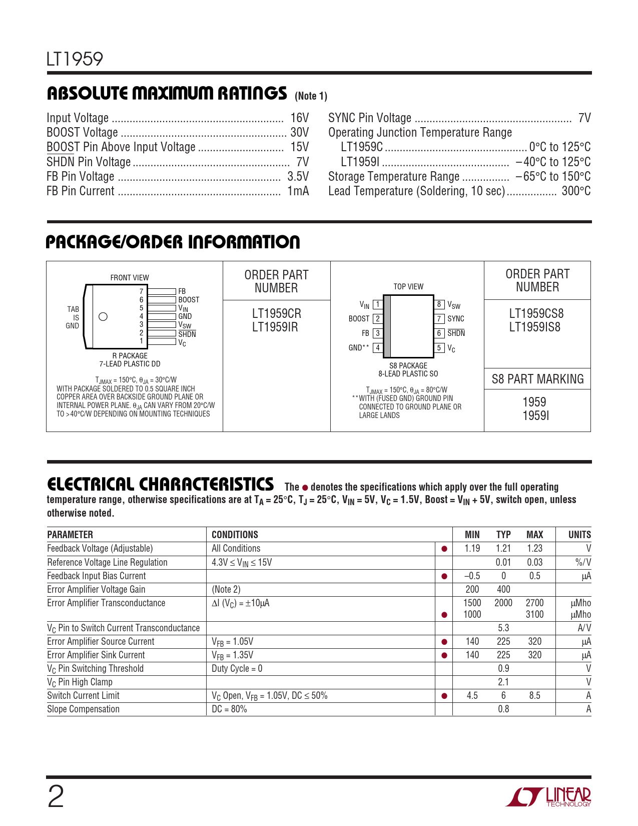 LT1959 WWWUABSOLUTE MAXIMUM RATINGS (Note 1) Input Voltage .. 16V SYNC Pin Voltage ... 7V BOOST Voltage .. 30V Operating Junction Temperature Range BOOST Pin Above Input Voltage ... 15V LT1959C .. 0°C to 125°C SHDN Pin Voltage ... 7V LT1959I ... – 40°C to 125°C FB Pin Voltage ... 3.5V Storage Temperature Range .. – 65°C to 150°C FB Pin Current ... 1mA Lead Temperature (Soldering, 10 sec)... 300°C UWUPACKAGE/ORDER INFORMATION FRONT VIEW ORDER PART ORDER PART 7 FB NUMBER TOP VIEW NUMBER 6 BOOST V 1 8 IN VSW 5 V TAB IN 4 GND LT1959CR IS LT1959CS8 BOOST 2 7 SYNC 3 V GND SW LT1959IR LT1959IS8 2 SHDN FB 3 6 SHDN 1 VC GND** 4 5 VC R PACKAGE 7-LEAD PLASTIC DD S8 PACKAGE 8-LEAD PLASTIC SO TJMAX = 150°C, θJA = 30°C/W S8 PART MARKING WITH PACKAGE SOLDERED TO 0.5 SQUARE INCH TJMAX = 150°C, θJA = 80°C/W COPPER AREA OVER BACKSIDE GROUND PLANE OR **WITH (FUSED GND) GROUND PIN INTERNAL POWER PLANE. θ 1959 JA CAN VARY FROM 20°C/W CONNECTED TO GROUND PLANE OR TO > 40°C/W DEPENDING ON MOUNTING TECHNIQUES LARGE LANDS 1959I ELECTRICAL CHARACTERISTICS The ● denotes the specifications which apply over the full operating temperature range, otherwise specifications are at TA = 25 ° C, TJ = 25 ° C, VIN = 5V, VC = 1.5V, Boost = VIN + 5V, switch open, unless otherwise noted.PARAMETERCONDITIONSMINTYPMAXUNITS Feedback Voltage (Adjustable) All Conditions ● 1.19 1.21 1.23 V Reference Voltage Line Regulation 4.3V ≤ VIN ≤ 15V 0.01 0.03 %/ V Feedback Input Bias Current ● –0.5 0 0.5 µA Error Amplifier Voltage Gain (Note 2) 200 400 Error Amplifier Transconductance ∆I (VC) = ±10µA 1500 2000 2700 µMho ● 1000 3100 µMho VC Pin to Switch Current Transconductance 5.3 A/ V Error Amplifier Source Current VFB = 1.05V ● 140 225 320 µA Error Amplifier Sink Current VFB = 1.35V ● 140 225 320 µA VC Pin Switching Threshold Duty Cycle = 0 0.9 V VC Pin High Clamp 2.1 V Switch Current Limit VC Open, VFB = 1.05V, DC ≤ 50% ● 4.5 6 8.5 A Slope Compensation DC = 80% 0.8 A 2