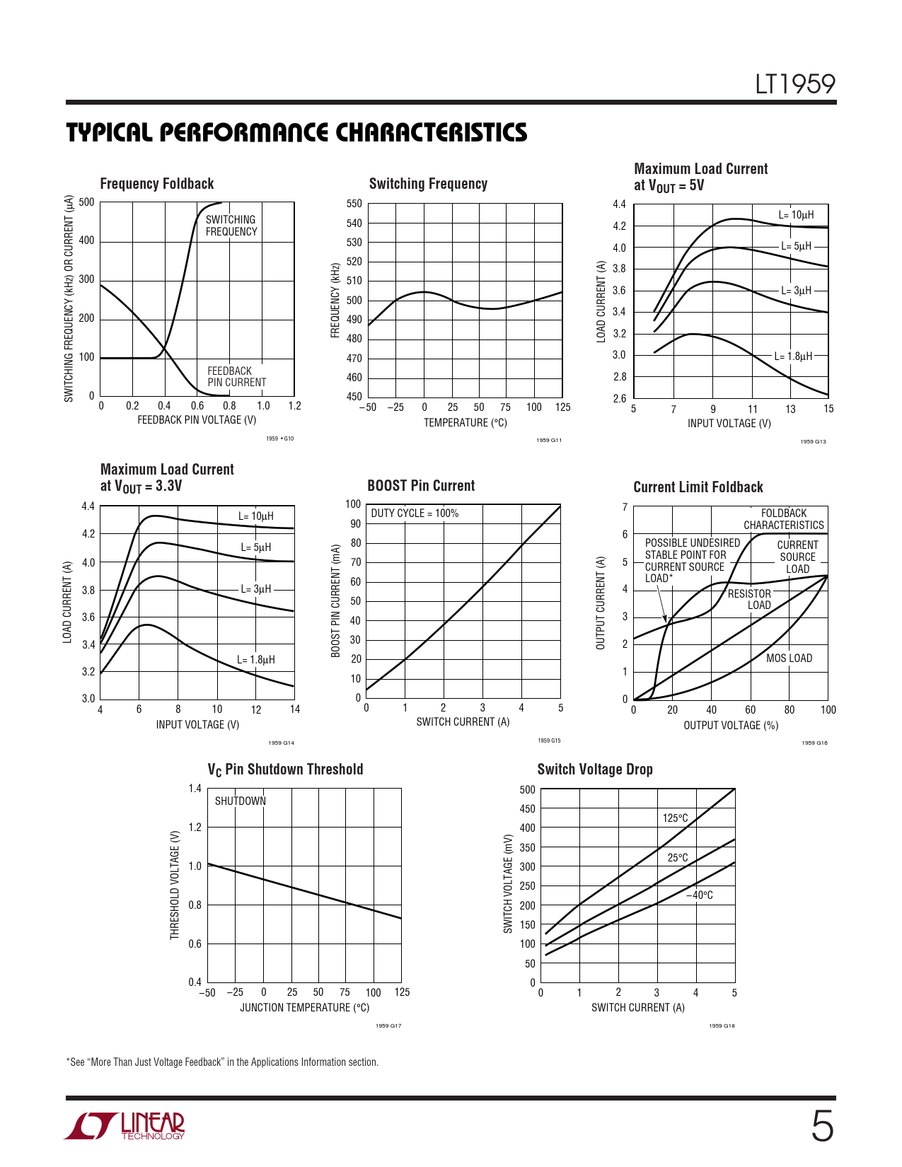 1.4 500 SHUTDOWN 450 125°C 1.2 400 350 25°C 1.0 300 250 – 40°C 0.8 200 150 SWITCH VOLTAGE (mV) THRESHOLD VOLTAGE (V) 0.6 100 50 0.4 0 –50 –25 0 25 50 75 100 125 0 1 2 3 4 5 JUNCTION TEMPERATURE (°C) SWITCH CURRENT (A) 1959 G17 1959 G18 *See “More Than Just Voltage Feedback” in the Applications Information section. 5