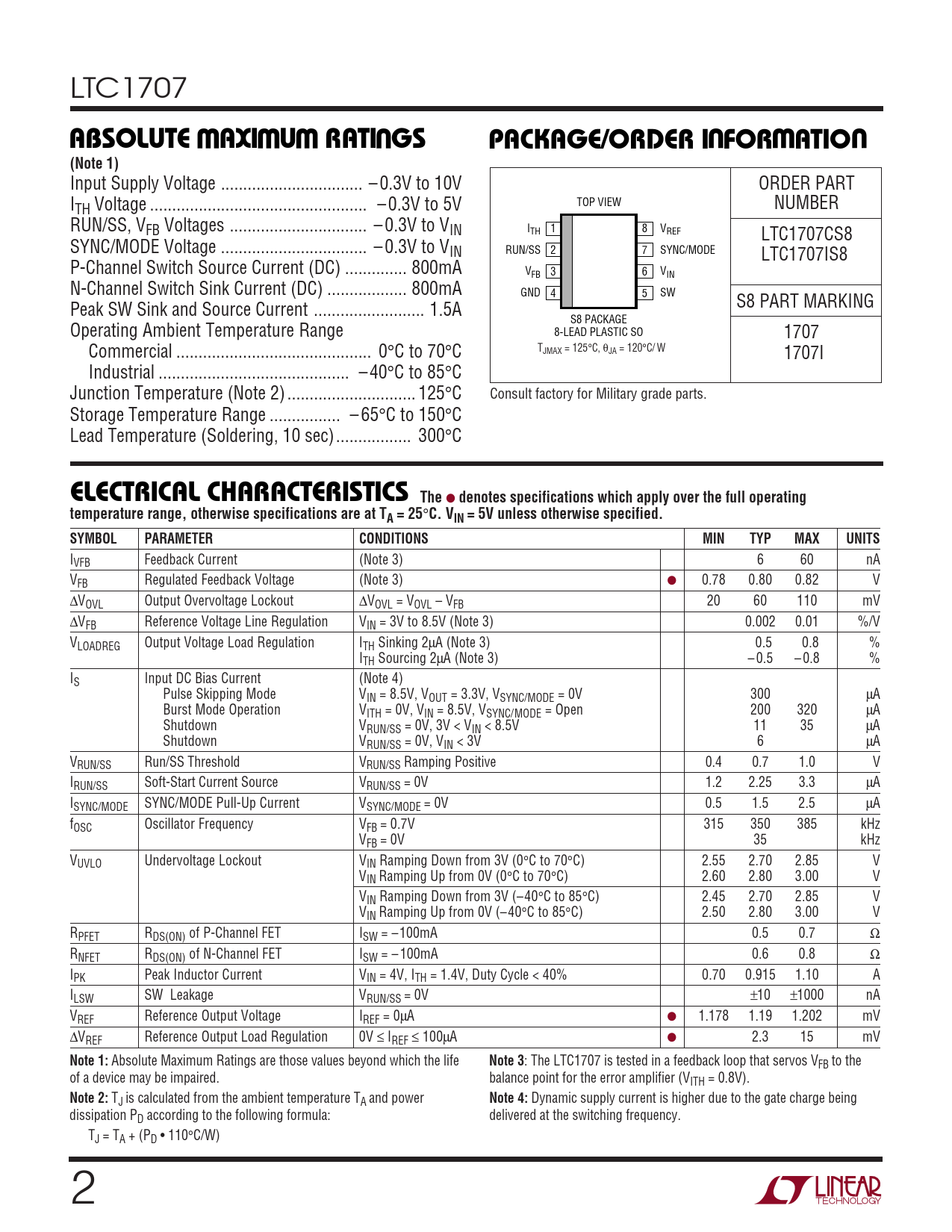 : The LTC1707 is tested in a feedback loop that servos VFB to the of a device may be impaired. balance point for the error amplifier (VITH = 0.8V).