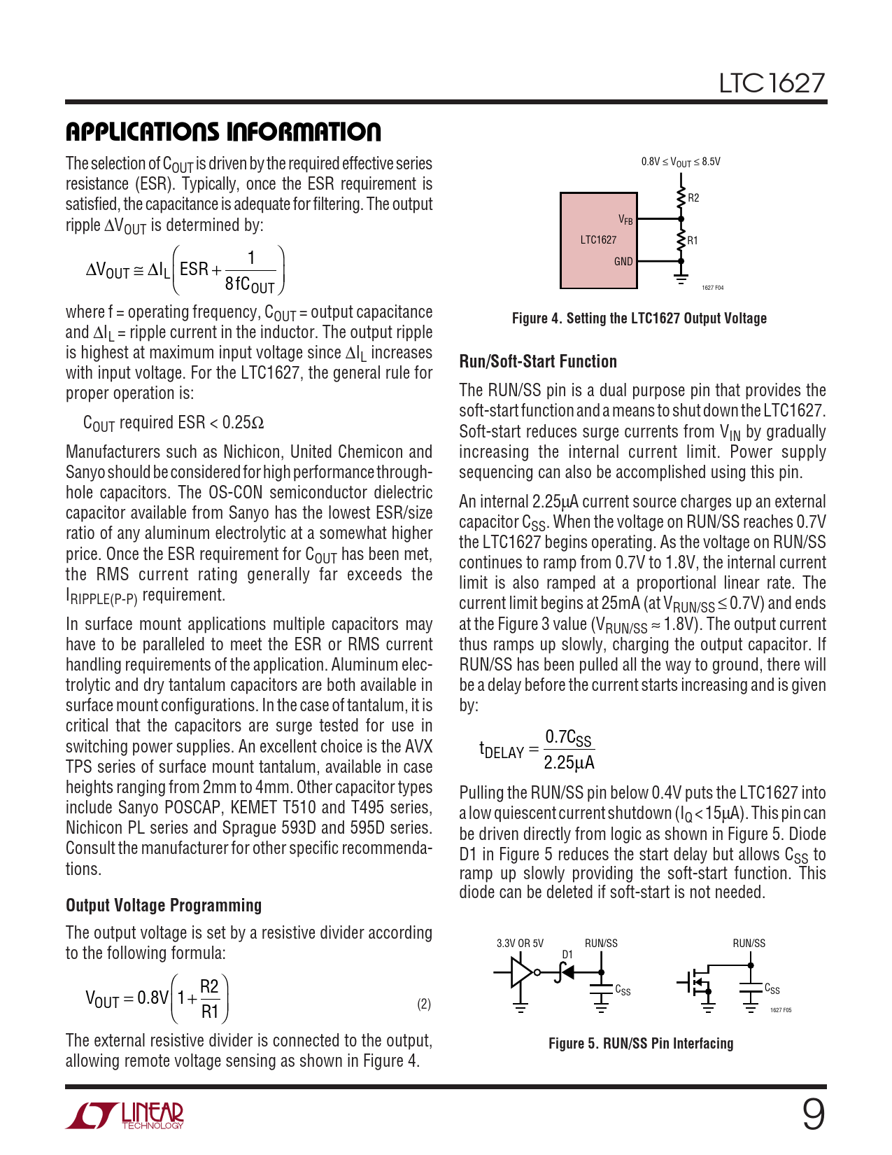 The output voltage is set by a resistive divider according 3.3V OR 5V RUN/SS RUN/SS to the following formula: D1  R2 C C SS SS V 0. V OUT = 8 1 + (2) 1627 F05  R1 The external resistive divider is connected to the output,