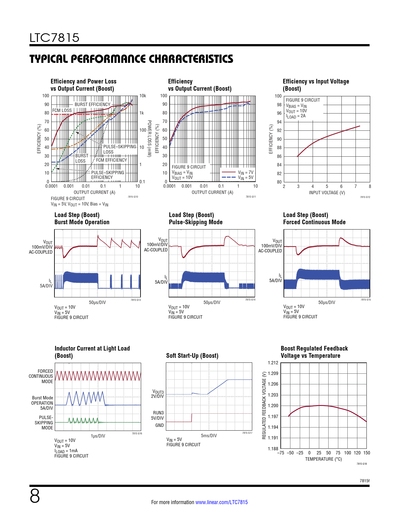 100 10k 100 100 FIGURE 9 CIRCUIT 90 BURST EFFICIENCY 90 98 VBIAS = VIN FCM LOSS VOUT = 10V 80 1k 80 96 ILOAD = 2A POWER LOSS (mW) 70 70 94 60 100 60 92 50 50 90 40 PULSE–SKIPPING 10 40 88 EFFICIENCY (%) LOSS EFFICIENCY (%) EFFICIENCY (%) 30 BURST 30 86 LOSS FCM EFFICIENCY 20 1 20 84 FIGURE 9 CIRCUIT 10 PULSE–SKIPPING 10 VBIAS = VIN VIN = 7V 82 EFFICIENCY VOUT = 10V VIN = 5V 0 0.1 0 80 0.0001 0.001 0.01 0.1 1 10 0.0001 0.001 0.01 0.1 1 10 2 3 4 5 6 7 8 OUTPUT CURRENT (A) OUTPUT CURRENT (A) INPUT VOLTAGE (V) 7815 G10 7815 G11 7815 G12 FIGURE 9 CIRCUIT VIN = 5V, VOUT = 10V, Bias = VIN