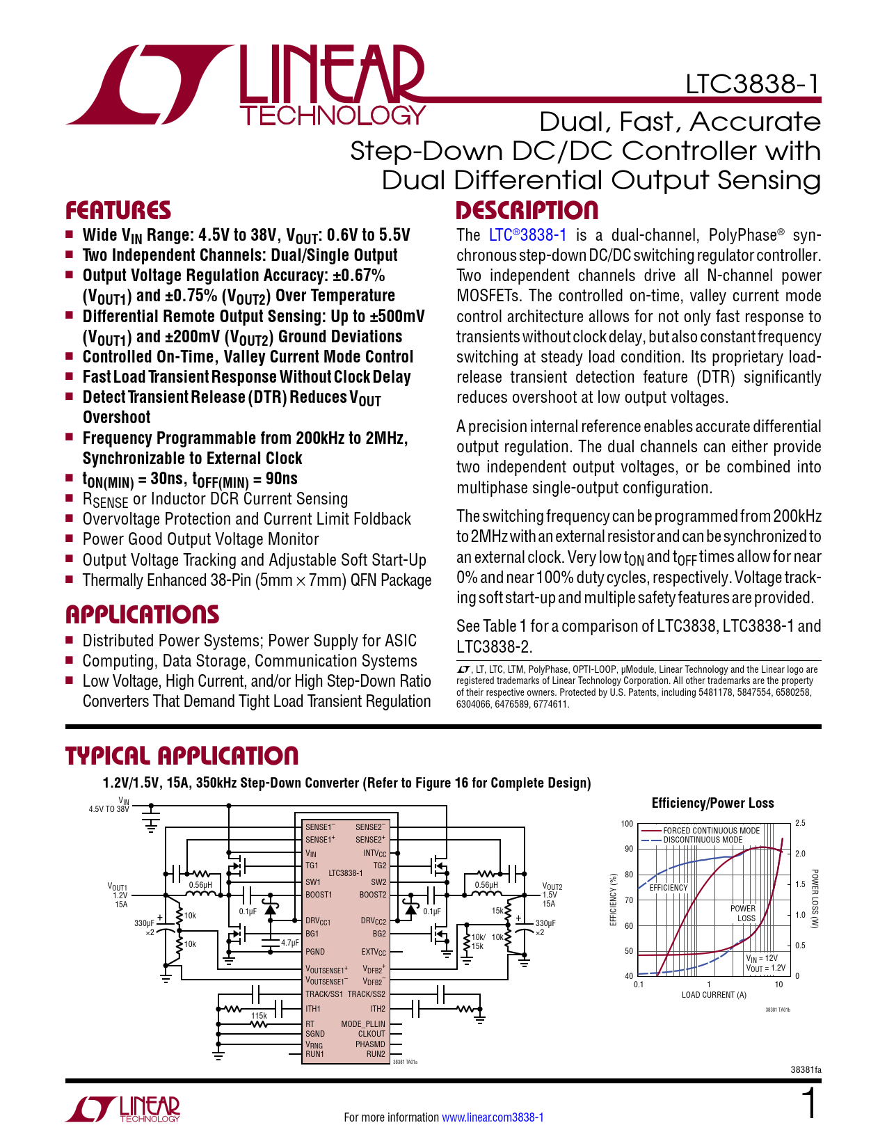 LTC3838-1 Dual, Fast, Accurate Step-Down DC/DC Controller with Dual Differential Output Sensing