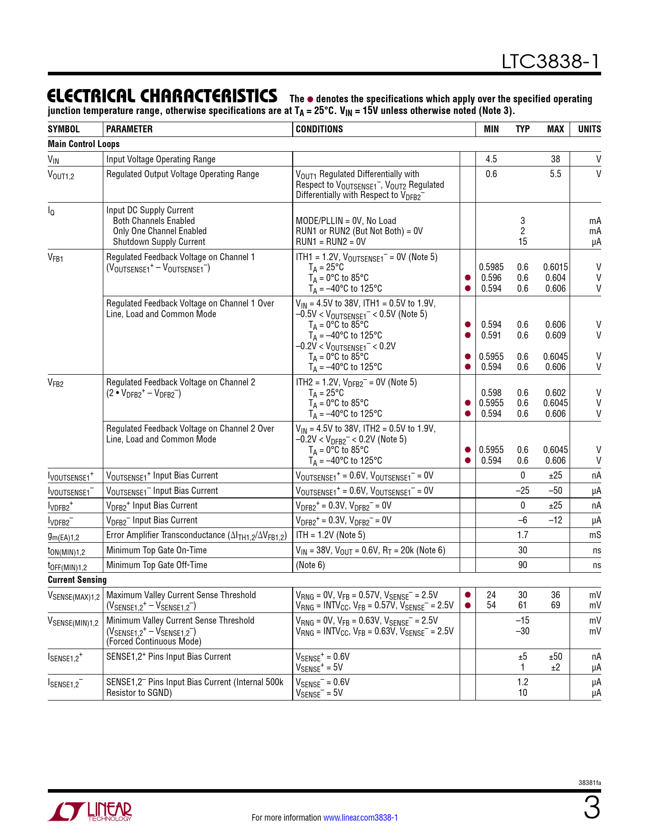 LTC3838-1 e lecTrical characTerisTics The l denotes the specifications which apply over the specified operatingjunction temperature range, otherwise specifications are at TA = 25°C. VIN = 15V unless otherwise noted (Note 3). SYMBOLPARAMETERCONDITIONSMINTYPMAXUNITSMain Control Loops VIN Input Voltage Operating Range 4.5 38 V VOUT1,2 Regulated Output Voltage Operating Range VOUT1 Regulated Differentially with 0.6 5.5 V Respect to V – OUTSENSE1 , VOUT2 Regulated Differentially with Respect to V – DFB2 IQ Input DC Supply Current Both Channels Enabled MODE/PLLIN = 0V, No Load 3 mA Only One Channel Enabled RUN1 or RUN2 (But Not Both) = 0V 2 mA Shutdown Supply Current RUN1 = RUN2 = 0V 15 µA V – FB1 Regulated Feedback Voltage on Channel 1 ITH1 = 1.2V, VOUTSENSE1 = 0V (Note 5) (V + – OUTSENSE1 – VOUTSENSE1 ) TA = 25°C 0.5985 0.6 0.6015 V TA = 0°C to 85°C l 0.596 0.6 0.604 V TA = –40°C to 125°C l 0.594 0.6 0.606 V Regulated Feedback Voltage on Channel 1 Over VIN = 4.5V to 38V, ITH1 = 0.5V to 1.9V, Line, Load and Common Mode –0.5V < V – OUTSENSE1 < 0.5V (Note 5) TA = 0°C to 85°C l 0.594 0.6 0.606 V TA = –40°C to 125°C l 0.591 0.6 0.609 V –0.2V < V – OUTSENSE1 < 0.2V TA = 0°C to 85°C l 0.5955 0.6 0.6045 V TA = –40°C to 125°C l 0.594 0.6 0.606 V V – FB2 Regulated Feedback Voltage on Channel 2 ITH2 = 1.2V, VDFB2 = 0V (Note 5) (2 • V + – DFB2 – VDFB2 ) TA = 25°C 0.598 0.6 0.602 V TA = 0°C to 85°C l 0.5955 0.6 0.6045 V TA = –40°C to 125°C l 0.594 0.6 0.606 V Regulated Feedback Voltage on Channel 2 Over VIN = 4.5V to 38V, ITH2 = 0.5V to 1.9V, Line, Load and Common Mode –0.2V < V – DFB2 < 0.2V (Note 5) TA = 0°C to 85°C l 0.5955 0.6 0.6045 V TA = –40°C to 125°C l 0.594 0.6 0.606 V I + + + – VOUTSENSE1 VOUTSENSE1 Input Bias Current VOUTSENSE1 = 0.6V, VOUTSENSE1 = 0V 0 ±25 nA I – – + – VOUTSENSE1 VOUTSENSE1 Input Bias Current VOUTSENSE1 = 0.6V, VOUTSENSE1 = 0V –25 –50 µA I + + + – VDFB2 VDFB2 Input Bias Current VDFB2 = 0.3V, VDFB2 = 0V 0 ±25 nA I – – + – VDFB2 VDFB2 Input Bias Current VDFB2 = 0.3V, VDFB2 = 0V –6 –12 µA gm(EA)1,2 Error Amplifier Transconductance (∆ITH1,2/∆VFB1,2) ITH = 1.2V (Note 5) 1.7 mS tON(MIN)1,2 Minimum Top Gate On-Time VIN = 38V, VOUT = 0.6V, RT = 20k (Note 6) 30 ns tOFF(MIN)1,2 Minimum Top Gate Off-Time (Note 6) 90 ns Current Sensing V – SENSE(MAX)1,2 Maximum Valley Current Sense Threshold VRNG = 0V, VFB = 0.57V, VSENSE = 2.5V l 24 30 36 mV (V + – – SENSE1,2 – VSENSE1,2 ) VRNG = INTVCC, VFB = 0.57V, VSENSE = 2.5V l 54 61 69 mV V – SENSE(MIN)1,2 Minimum Valley Current Sense Threshold VRNG = 0V, VFB = 0.63V, VSENSE = 2.5V –15 mV (V + – – SENSE1,2 – VSENSE1,2 ) VRNG = INTVCC, VFB = 0.63V, VSENSE = 2.5V –30 mV (Forced Continuous Mode) I + + SENSE1,2 SENSE1,2+ Pins Input Bias Current VSENSE = 0.6V ±5 ±50 nA V + SENSE = 5V 1 ±2 µA I – – SENSE1,2 SENSE1,2– Pins Input Bias Current (Internal 500k VSENSE = 0.6V 1.2 µA Resistor to SGND) V – SENSE = 5V 10 µA 38381fa For more information www.linear.com3838-1 3 Document Outline Features Applications Description Typical Application Absolute Maximum Ratings Pin Configuration Electrical Characteristics Pin Functions Functional Diagram Operation Applications Information Typical Applications Package Description Revision History Typical Application Related Parts