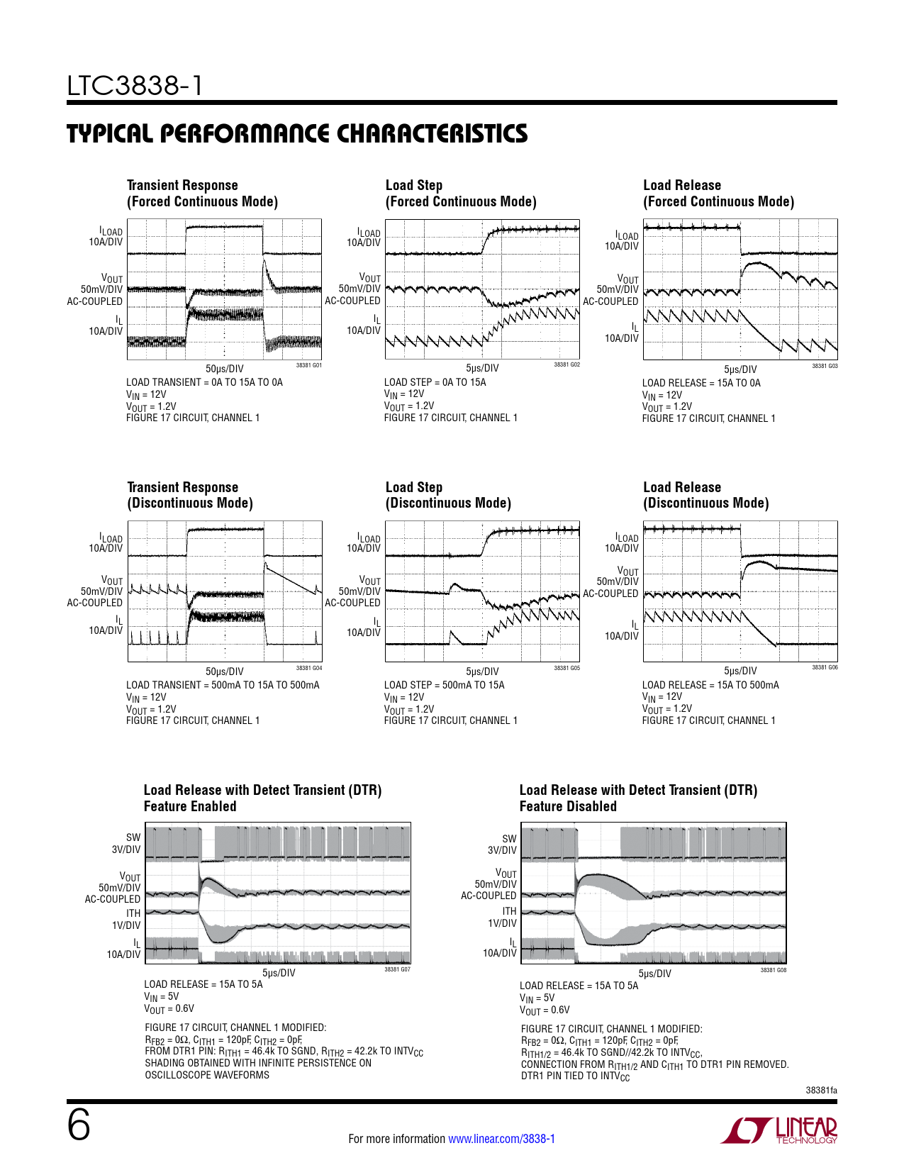 ILOAD ILOAD ILOAD 10A/DIV 10A/DIV 10A/DIV VOUT VOUT VOUT 50mV/DIV 50mV/DIV 50mV/DIV AC-COUPLED AC-COUPLED AC-COUPLED IL IL I 10A/DIV 10A/DIV L 10A/DIV 50µs/DIV 38381 G04 5µs/DIV 38381 G05 5µs/DIV 38381 G06 LOAD TRANSIENT = 500mA TO 15A TO 500mA LOAD STEP = 500mA TO 15A LOAD RELEASE = 15A TO 500mA VIN = 12V VIN = 12V VIN = 12V VOUT = 1.2V VOUT = 1.2V VOUT = 1.2V FIGURE 17 CIRCUIT, CHANNEL 1 FIGURE 17 CIRCUIT, CHANNEL 1 FIGURE 17 CIRCUIT, CHANNEL 1
