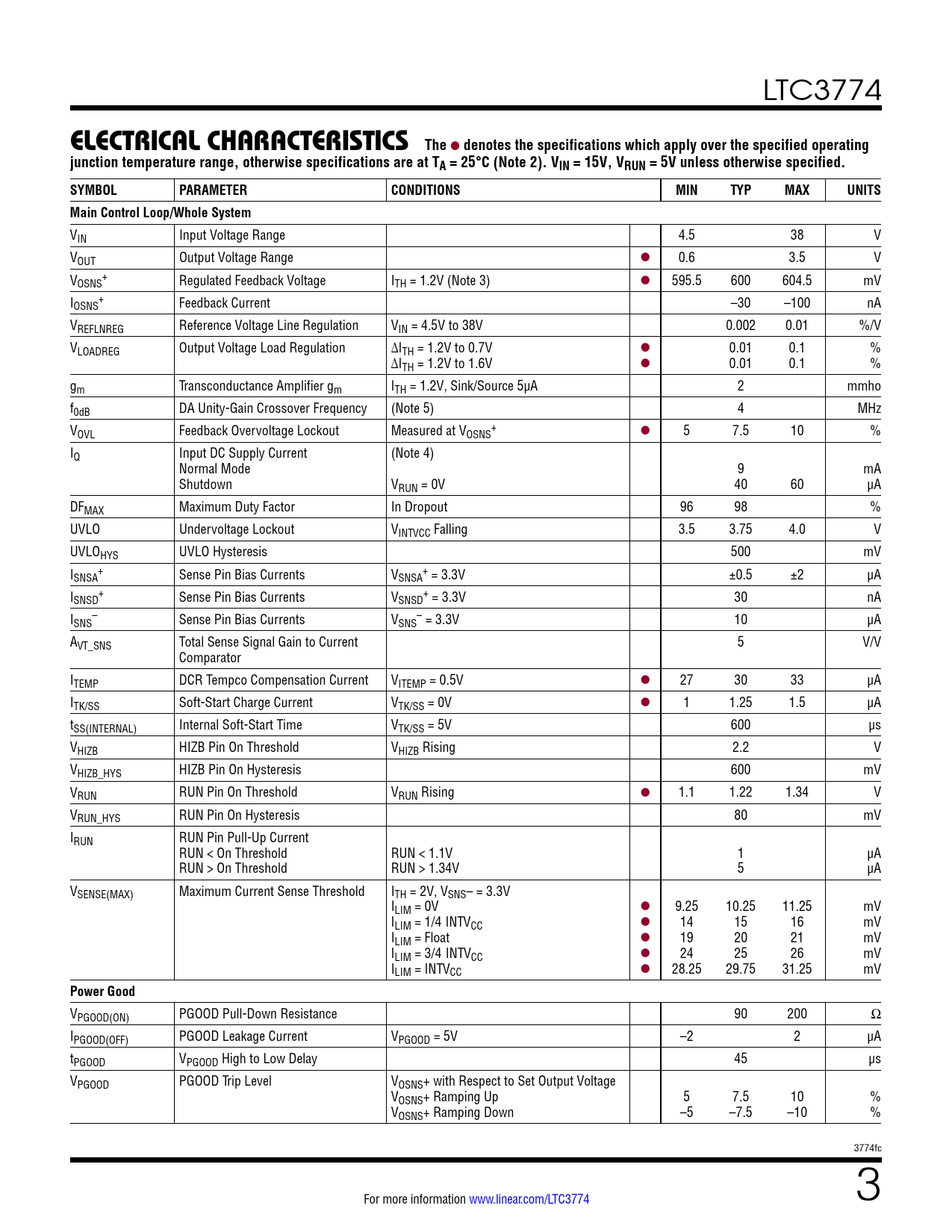 VPGOOD(ON) PGOOD Pull-Down Resistance 90 200 Ω IPGOOD(OFF) PGOOD Leakage Current VPGOOD = 5V –2 2 µA tPGOOD VPGOOD High to Low Delay 45 µs VPGOOD PGOOD Trip Level VOSNS+ with Respect to Set Output Voltage VOSNS+ Ramping Up 5 7.5 10 % VOSNS+ Ramping Down –5 –7.5 –10 % 3774fc For more information www.linear.com/LTC3774 3 Document Outline Features Applications Description Typical Application Absolute Maximum Ratings Pin Configuration Order Information Electrical Characteristics Typical Performance Characteristics Pin Functions Functional Block Diagram Operation Applications Information Typical Applications Package Description Typical Application Related Parts