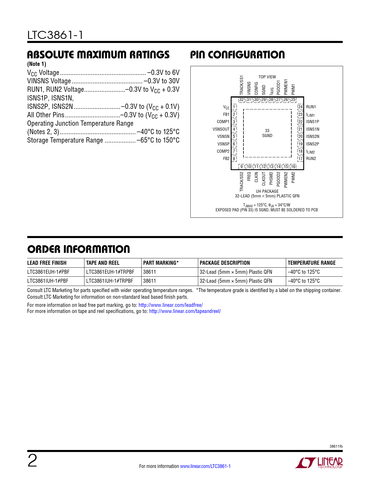 LTC3861-1 absoluTe maximum raTingspin conFiguraTion(Note 1) VCC Voltage .. –0.3V to 6V VINSNS Voltage ... –0.3V to 30V TOP VIEW RUN1, RUN2 Voltage ..–0.3V to VCC + 0.3V ISNS1P TRACK/SS1 VINSNS CONFIG SGND I AVG PGOOD1 PWMEN1 PWM1 , ISNS1N, 32 31 30 29 28 27 26 25 ISNS2P , ISNS2N ...–0.3V to (VCC + 0.1V) VCC 1 24 RUN1 All Other Pins ..–0.3V to (VCC + 0.3V) FB1 2 23 ILIM1 Operating Junction Temperature Range COMP1 3 22 ISNS1P (Notes 2, 3) .. –40°C to 125°C VSNSOUT 4 33 21 ISNS1N VSNSN 5 SGND Storage Temperature Range .. –65°C to 150°C 20 ISNS2N VSNSP 6 19 ISNS2P COMP2 7 18 ILIM2 FB2 8 17 RUN2 9 10 11 12 13 14 15 16 FREQ CLKIN PWM2 CLKOUT PHSMD PGOOD2 PWMEN2 TRACK/SS2 UH PACKAGE 32-LEAD (5mm × 5mm) PLASTIC QFN TJMAX = 125°C, θJA = 34°C/W EXPOSED PAD (PIN 33) IS SGND, MUST BE SOLDERED TO PCB orDer inFormaTion LEAD FREE FINISHTAPE AND REELPART MARKING*PACKAGE DESCRIPTIONTEMPERATURE RANGE LTC3861EUH-1#PBF LTC3861EUH-1#TRPBF 38611 32-Lead (5mm × 5mm) Plastic QFN –40°C to 125°C LTC3861IUH-1#PBF LTC3861IUH-1#TRPBF 38611 32-Lead (5mm × 5mm) Plastic QFN –40°C to 125°C Consult LTC Marketing for parts specified with wider operating temperature ranges. *The temperature grade is identified by a label on the shipping container. Consult LTC Marketing for information on non-standard lead based finish parts. For more information on lead free part marking, go to: http://www.linear.com/leadfree/ For more information on tape and reel specifications, go to: http://www.linear.com/tapeandreel/ 38611fb 2 For more information www.linear.com/LTC3861-1 Document Outline Features Applications Description Typical Application Absolute Maximum Ratings Pin Configuration Order Information Electrical Characteristics Typical Performance Characteristics Pin Functions Functional Diagram Operation Applications Information Typical Applications Package Description Related Parts