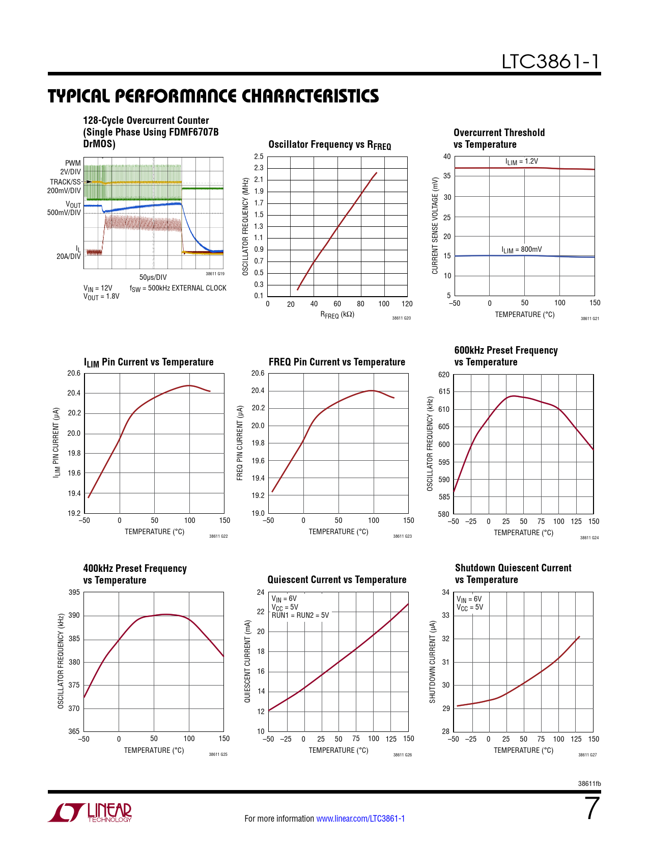2.5 40 PWM ILIM = 1.2V 2V/DIV 2.3 35 TRACK/SS 2.1 200mV/DIV 1.9 30 VOUT 1.7 TAGE (mV) 500mV/DIV 1.5 25 1.3 1.1 20 IL 0.9 ILIM = 800mV 20A/DIV 15 0.7 0.5 CURRENT SENSE VOL 50µs/DIV 38611 G19 OSCILLATOR FREQUENCY (MHz) 10 V 0.3 IN = 12V fSW = 500kHz EXTERNAL CLOCK VOUT = 1.8V 0.1 5 0 20 40 60 80 100 120 –50 0 50 100 150 RFREQ (kΩ) TEMPERATURE (°C) 38611 G20 38611 G21