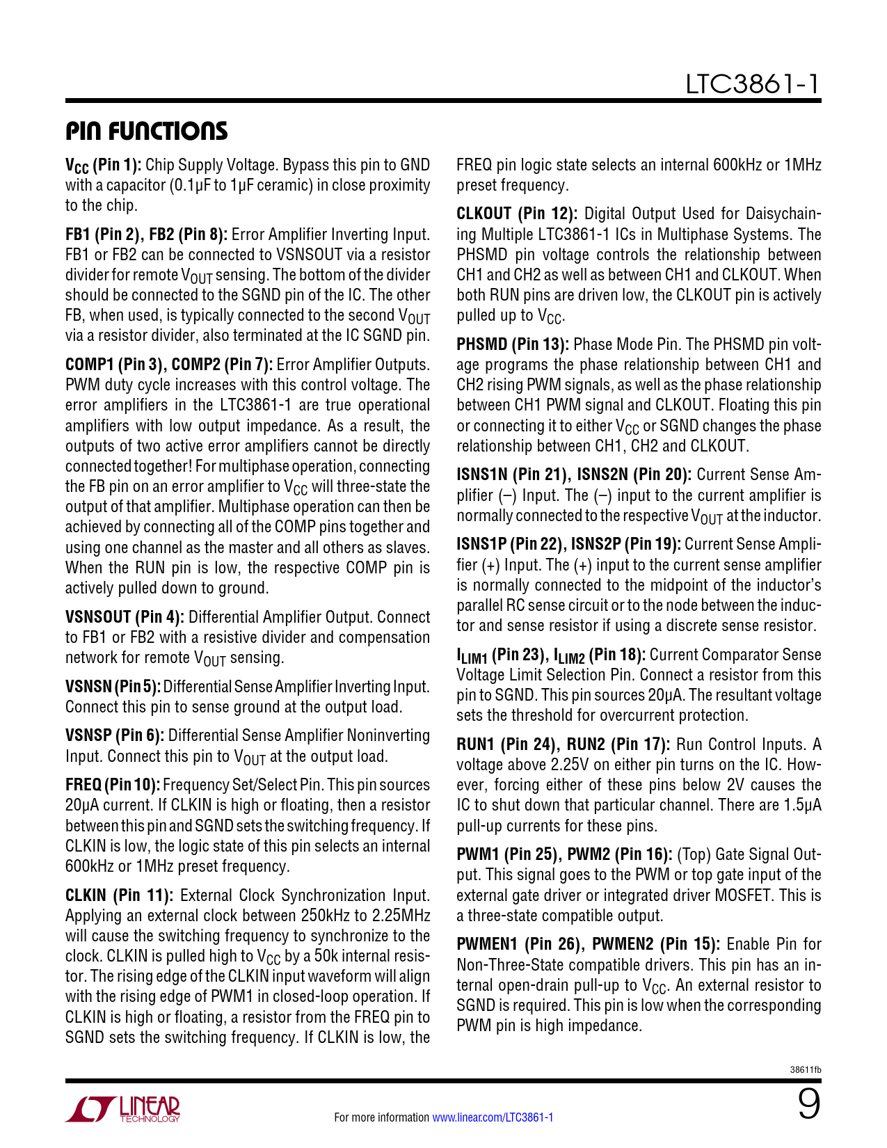 LTC3861-1 pin FuncTions VCC (Pin 1): Chip Supply Voltage. Bypass this pin to GND FREQ pin logic state selects an internal 600kHz or 1MHz with a capacitor (0.1µF to 1µF ceramic) in close proximity preset frequency. to the chip. CLKOUT (Pin 12): Digital Output Used for Daisychain- FB1 (Pin 2), FB2 (Pin 8): Error Amplifier Inverting Input. ing Multiple LTC3861-1 ICs in Multiphase Systems. The FB1 or FB2 can be connected to VSNSOUT via a resistor PHSMD pin voltage controls the relationship between divider for remote VOUT sensing. The bottom of the divider CH1 and CH2 as well as between CH1 and CLKOUT. When should be connected to the SGND pin of the IC. The other both RUN pins are driven low, the CLKOUT pin is actively FB, when used, is typically connected to the second VOUT pulled up to VCC. via a resistor divider, also terminated at the IC SGND pin. PHSMD (Pin 13): Phase Mode Pin. The PHSMD pin volt- COMP1 (Pin 3), COMP2 (Pin 7): Error Amplifier Outputs. age programs the phase relationship between CH1 and PWM duty cycle increases with this control voltage. The CH2 rising PWM signals, as well as the phase relationship error amplifiers in the LTC3861-1 are true operational between CH1 PWM signal and CLKOUT. Floating this pin amplifiers with low output impedance. As a result, the or connecting it to either VCC or SGND changes the phase outputs of two active error amplifiers cannot be directly relationship between CH1, CH2 and CLKOUT. connected together! For multiphase operation, connecting ISNS1N (Pin 21), ISNS2N (Pin 20): Current Sense Am- the FB pin on an error amplifier to VCC will three-state the plifier (–) Input. The (–) input to the current amplifier is output of that amplifier. Multiphase operation can then be normally connected to the respective V achieved by connecting all of the COMP pins together and OUT at the inductor. using one channel as the master and all others as slaves. ISNS1P (Pin 22), ISNS2P (Pin 19): Current Sense Ampli- When the RUN pin is low, the respective COMP pin is fier (+) Input. The (+) input to the current sense amplifier actively pulled down to ground. is normally connected to the midpoint of the inductor’s parallel RC sense circuit or to the node between the induc- VSNSOUT (Pin 4): Differential Amplifier Output. Connect tor and sense resistor if using a discrete sense resistor. to FB1 or FB2 with a resistive divider and compensation network for remote VOUT sensing. ILIM1 (Pin 23), ILIM2 (Pin 18): Current Comparator Sense Voltage Limit Selection Pin. Connect a resistor from this VSNSN (Pin 5): Differential Sense Amplifier Inverting Input. pin to SGND. This pin sources 20µA. The resultant voltage Connect this pin to sense ground at the output load. sets the threshold for overcurrent protection. VSNSP (Pin 6): Differential Sense Amplifier Noninverting RUN1 (Pin 24), RUN2 (Pin 17): Run Control Inputs. A Input. Connect this pin to VOUT at the output load. voltage above 2.25V on either pin turns on the IC. How- FREQ (Pin 10): Frequency Set/Select Pin. This pin sources ever, forcing either of these pins below 2V causes the 20µA current. If CLKIN is high or floating, then a resistor IC to shut down that particular channel. There are 1.5µA between this pin and SGND sets the switching frequency. If pull-up currents for these pins. CLKIN is low, the logic state of this pin selects an internal PWM1 (Pin 25), PWM2 (Pin 16): (Top) Gate Signal Out- 600kHz or 1MHz preset frequency. put. This signal goes to the PWM or top gate input of the CLKIN (Pin 11): External Clock Synchronization Input. external gate driver or integrated driver MOSFET. This is Applying an external clock between 250kHz to 2.25MHz a three-state compatible output. will cause the switching frequency to synchronize to the PWMEN1 (Pin 26), PWMEN2 (Pin 15): Enable Pin for clock. CLKIN is pulled high to VCC by a 50k internal resis- Non-Three-State compatible drivers. This pin has an in- tor. The rising edge of the CLKIN input waveform will align ternal open-drain pull-up to V with the rising edge of PWM1 in closed-loop operation. If CC. An external resistor to SGND is required. This pin is low when the corresponding CLKIN is high or floating, a resistor from the FREQ pin to PWM pin is high impedance. SGND sets the switching frequency. If CLKIN is low, the 38611fb For more information www.linear.com/LTC3861-1 9 Document Outline Features Applications Description Typical Application Absolute Maximum Ratings Pin Configuration Order Information Electrical Characteristics Typical Performance Characteristics Pin Functions Functional Diagram Operation Applications Information Typical Applications Package Description Related Parts