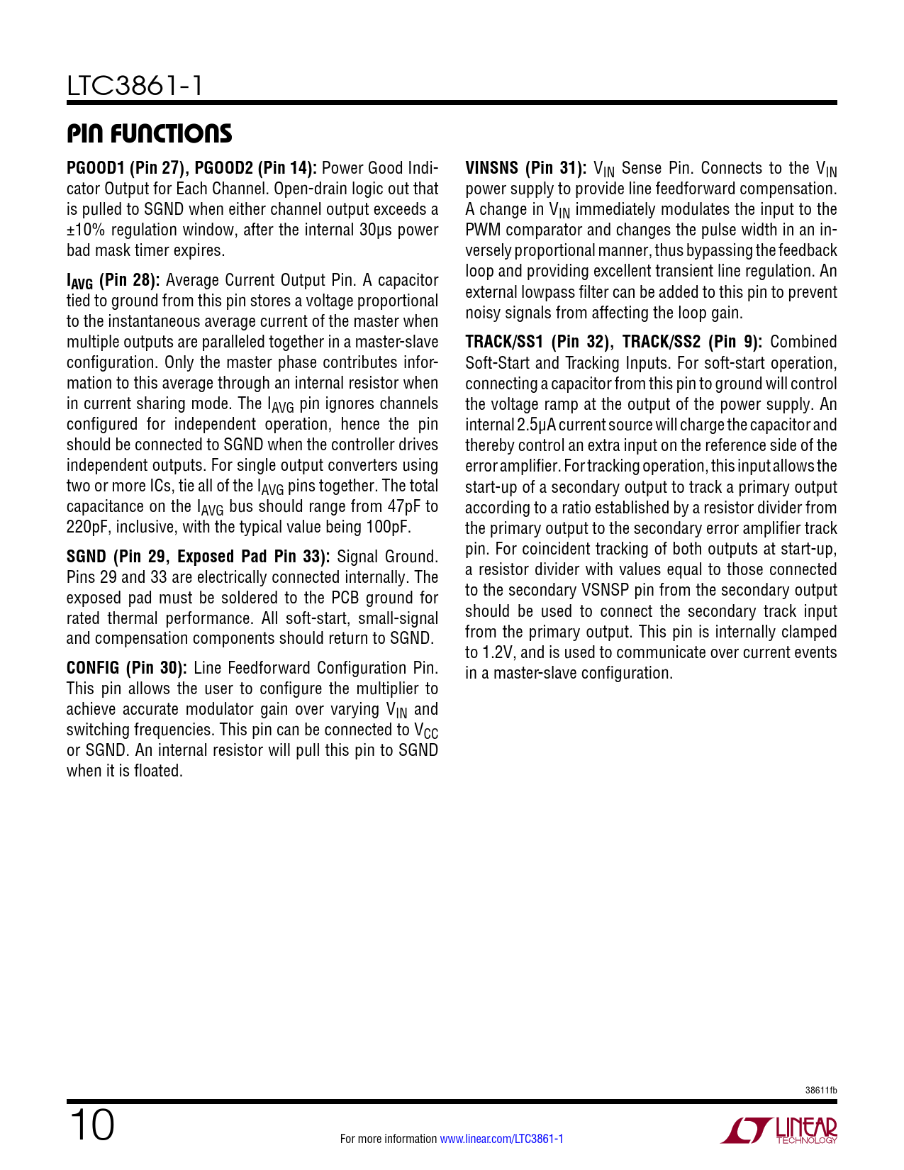 pin FuncTions PGOOD1 (Pin 27), PGOOD2 (Pin 14):. VINSNS (Pin 31):. AVG (Pin 28):. TRACK/SS1 (Pin 32), TRACK/SS2 (Pin 9):