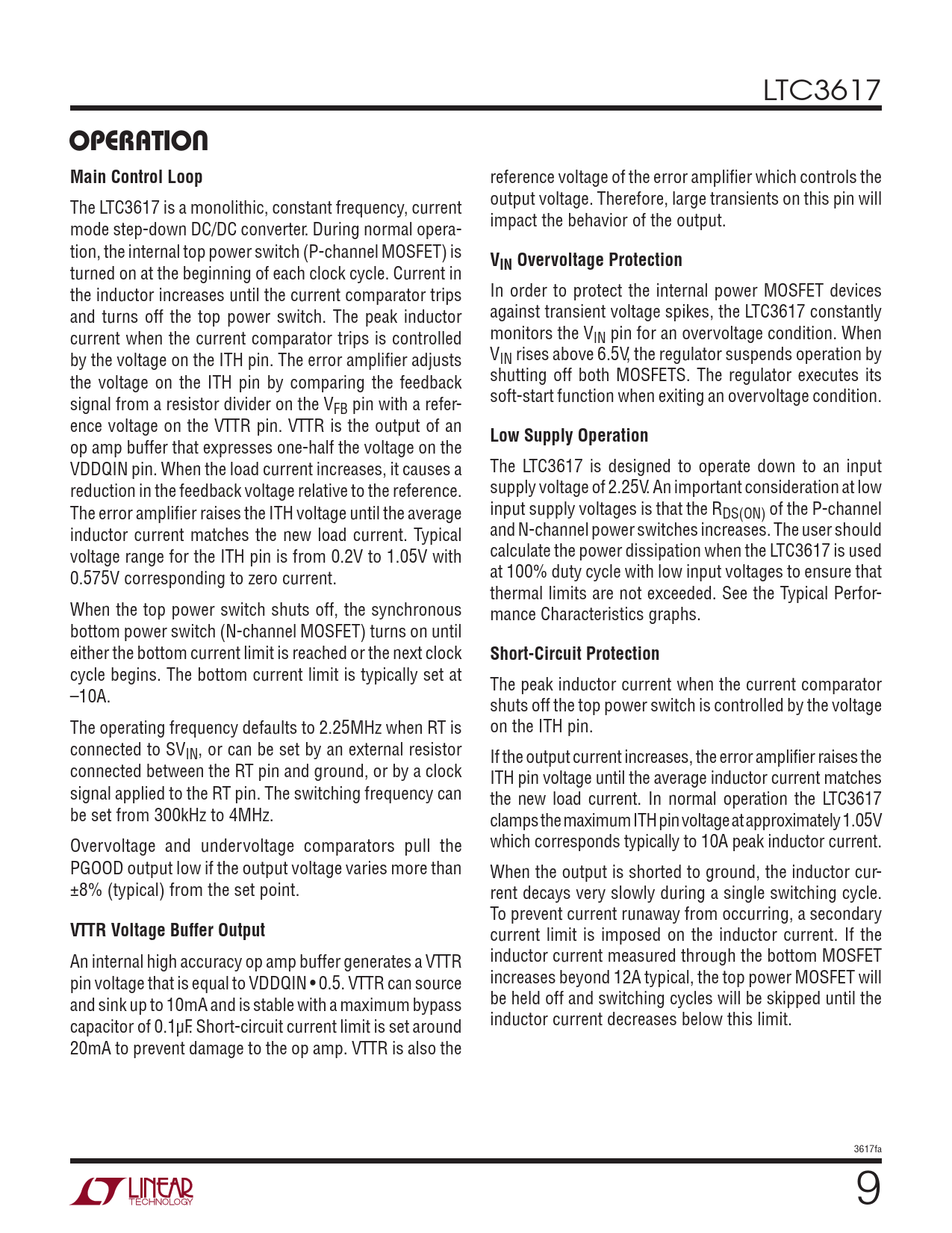 turned on at the beginning of each clock cycle. Current in the inductor increases until the current comparator trips In order to protect the internal power MOSFET devices against transient voltage spikes, the LTC3617 constantly and turns off the top power switch. The peak inductor monitors the V current when the current comparator trips is controlled IN pin for an overvoltage condition. When V by the voltage on the ITH pin. The error amplifier adjusts IN rises above 6.5V, the regulator suspends operation by shutting off both MOSFETS. The regulator executes its the voltage on the ITH pin by comparing the feedback soft-start function when exiting an overvoltage condition. signal from a resistor divider on the VFB pin with a refer- ence voltage on the VTTR pin. VTTR is the output of an