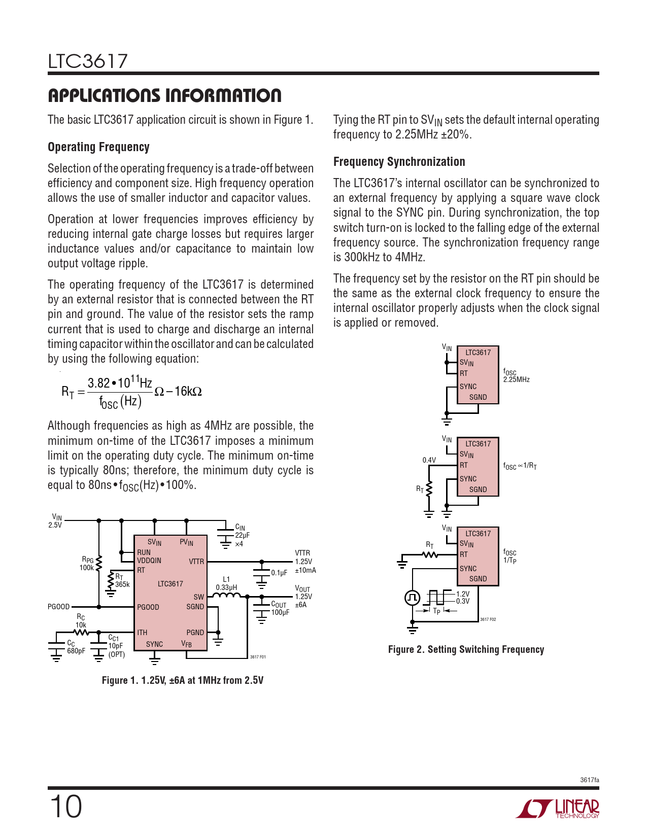 LTC3617 applications inForMation The basic LTC3617 application circuit is shown in Figure 1. Tying the RT pin to SVIN sets the default internal operating frequency to 2.25MHz ±20%. Operating Frequency Selection of the operating frequency is a trade-off between Frequency Synchronization efficiency and component size. High frequency operation The LTC3617’s internal oscillator can be synchronized to allows the use of smaller inductor and capacitor values. an external frequency by applying a square wave clock Operation at lower frequencies improves efficiency by signal to the SYNC pin. During synchronization, the top reducing internal gate charge losses but requires larger switch turn-on is locked to the falling edge of the external inductance values and/or capacitance to maintain low frequency source. The synchronization frequency range output voltage ripple. is 300kHz to 4MHz. The operating frequency of the LTC3617 is determined The frequency set by the resistor on the RT pin should be by an external resistor that is connected between the RT the same as the external clock frequency to ensure the pin and ground. The value of the resistor sets the ramp internal oscillator properly adjusts when the clock signal current that is used to charge and discharge an internal is applied or removed. timing capacitor within the oscillator and can be calculated VIN by using the following equation: LTC3617 SVIN f RT OSC 3.82 • 1011Hz 2.25MHz R SYNC T = SGND fOSC H ( z) Ω–16kΩ Although frequencies as high as 4MHz are possible, the minimum on-time of the LTC3617 imposes a minimum VIN LTC3617 limit on the operating duty cycle. The minimum on-time SVIN 0.4V is typically 80ns; therefore, the minimum duty cycle is RT fOSC ∝1/RT equal to 80ns • f SYNC OSC(Hz)•100%. RT SGND VIN 2.5V CIN VIN 22µF LTC3617 SVIN PVIN ×4 R SV T IN RUN VTTR f RT OSC RPG VDDQIN VTTR 1.25V 1/TP 100k RT 0.1µF ±10mA SYNC RT SGND 365k LTC3617 L1 0.33µH VOUT SW 1.25V 1.2V 0.3V PGOOD PGOOD SGND COUT ±6A 100µF T R P C 3617 F02 10k ITH PGND C C C1 C 10pF SYNC VFB 680pF Figure 2. Setting Switching Frequency (OPT) 3617 F01 Figure 1. 1.25V, ±6A at 1MHz from 2.5V 3617fa 10 Document Outline Features Applications Description Typical Application Absolute Maximum Ratings Pin Configuration Order Information Electrical Characteristics Typical Performance Characteristics Pin Functions Functional Block Diagram Operation Applications Information Typical Applications Package Description Revision History Typical Application Related Parts