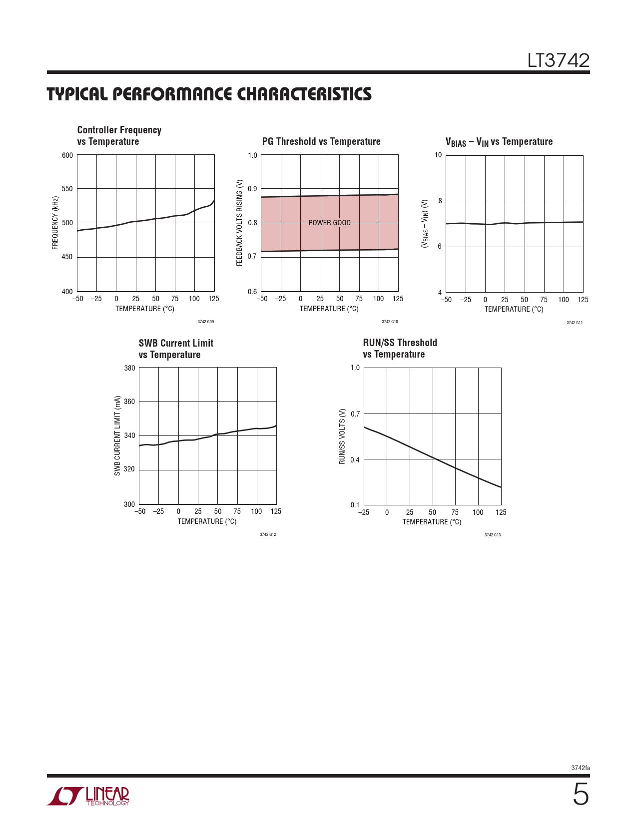 600 1.0 10 550 0.9 8 ) (V) IN 500 0.8 POWER GOOD – V BIAS FREQUENCY (kHz) (V 6 450 0.7 FEEDBACK VOLTS RISING (V) 400 0.6 4 –50 –25 0 25 50 75 100 125 –50 –25 0 25 50 75 100 125 –50 –25 0 25 50 75 100 125 TEMPERATURE (°C) TEMPERATURE (°C) TEMPERATURE (°C) 3742 G09 3742 G10 3742 G11