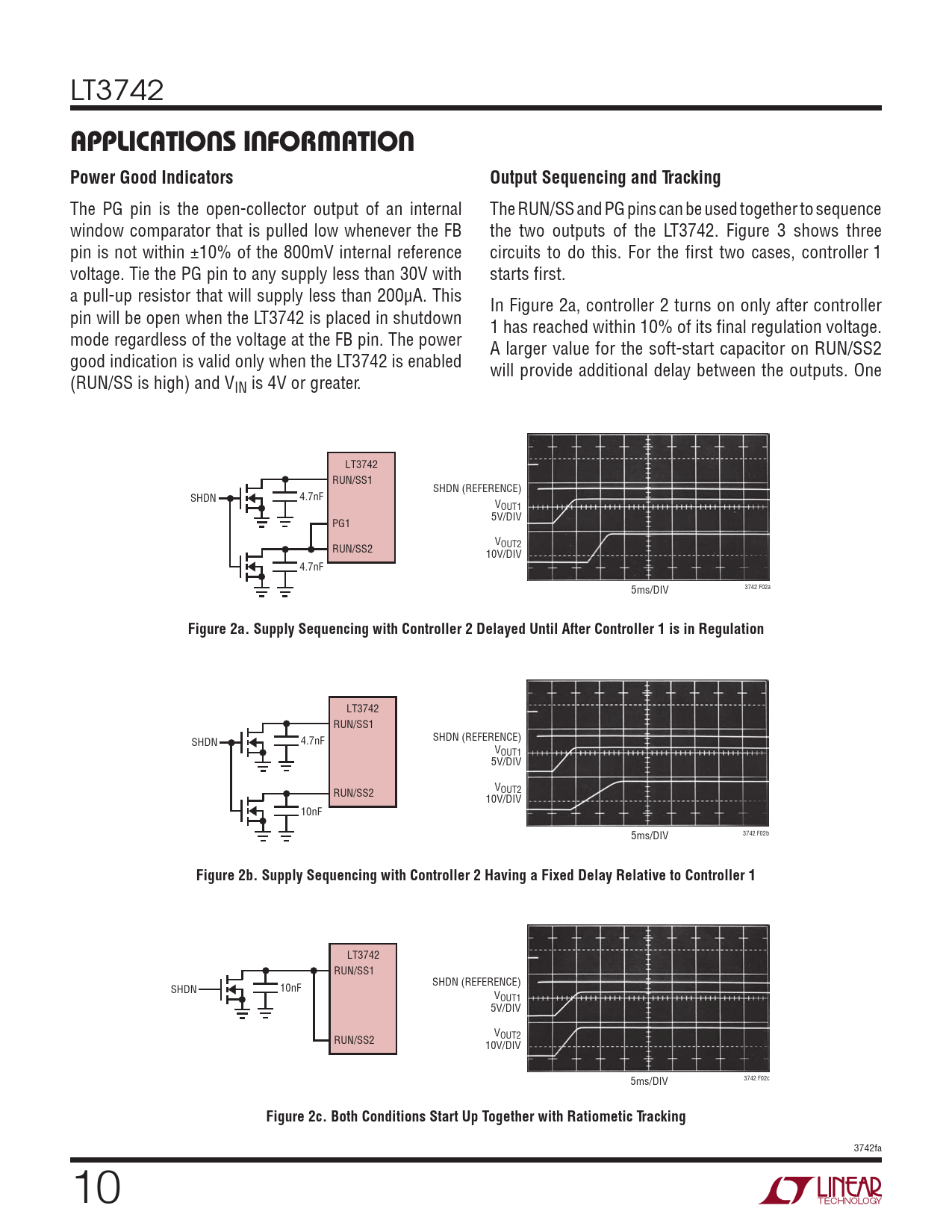 LT3742 RUN/SS1 SHDN (REFERENCE) SHDN 10nF VOUT1 5V/DIV V RUN/SS2 OUT2 10V/DIV 3742 F02c 5ms/DIV
