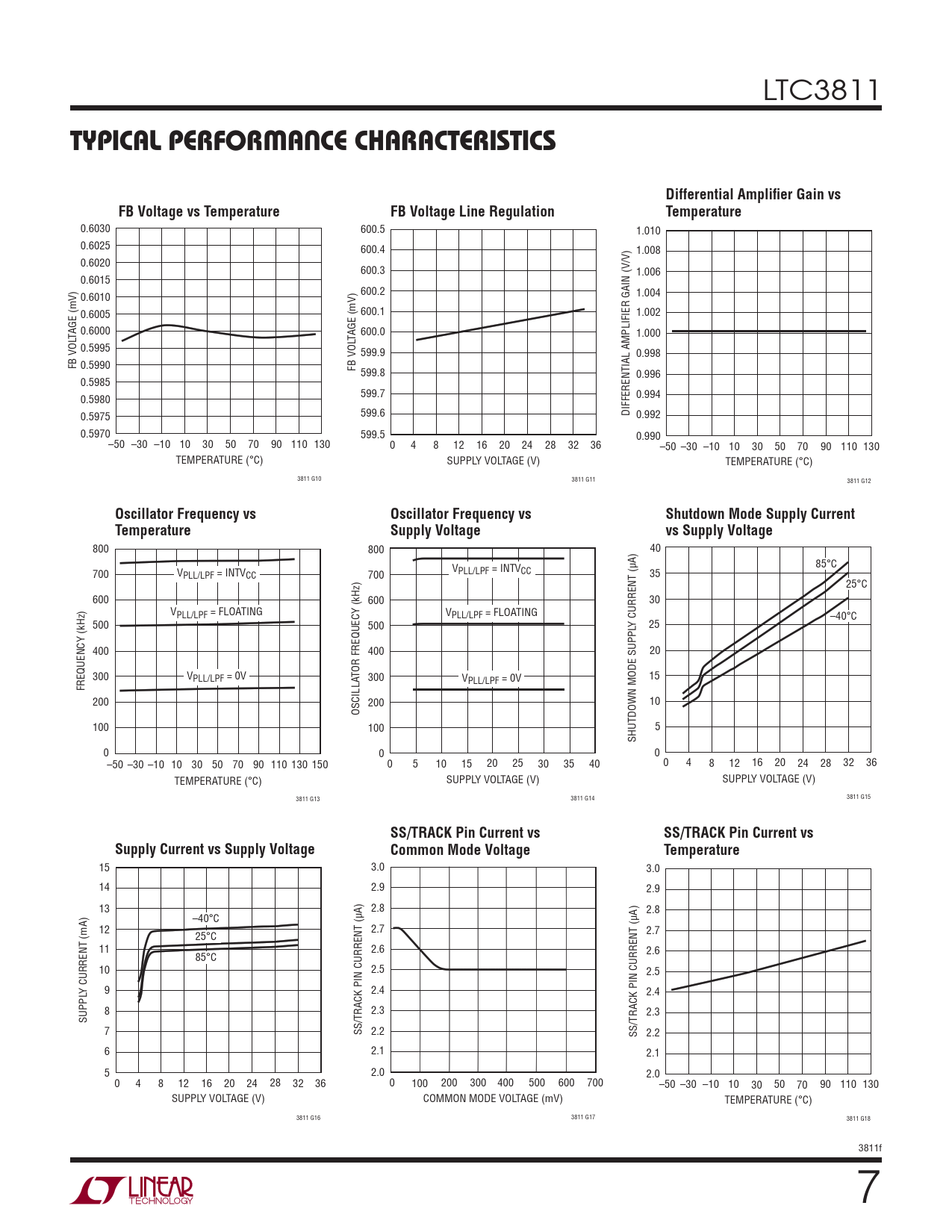 800 800 40 V 85°C 700 V PLL/LPF = INTVCC PLL/LPF = INTVCC 700 35 25°C 600 600 30 VPLL/LPF = FLOATING VPLL/LPF = FLOATING –40°C 500 500 Y CURRENT (μA) 25 400 400 20 300 V TOR FREQUECY (kHz) PLL/LPF = 0V 300 V 15 PLL/LPF = 0V FREQUENCY (kHz) 200 200 10 OSCILLA 100 100 5 SHUTDOWN MODE SUPPL 0 0 0 –50 –30 –10 10 30 50 70 90 110 130 150 0 5 10 15 20 25 30 35 40 0 4 8 12 16 20 24 28 32 36 TEMPERATURE (°C) SUPPLY VOLTAGE (V) SUPPLY VOLTAGE (V) 3811 G13 3811 G14 3811 G15