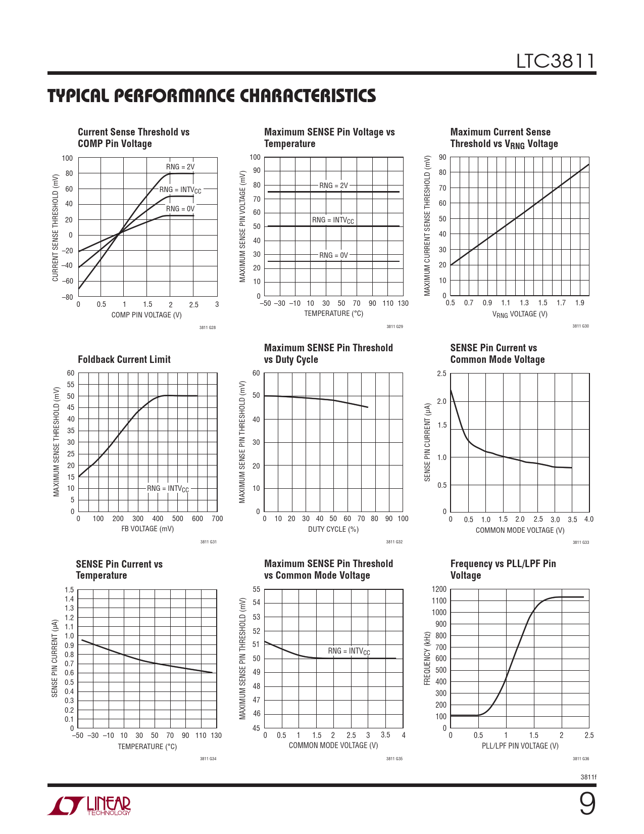100 100 90 RNG = 2V 80 90 80 80 RNG = 2V 60 RNG = INTV 70 CC TAGE (mV) 70 40 60 RNG = 0V 60 20 RNG = INTV 50 CC 50 0 40 40 –20 30 30 RNG = 0V –40 20 20 CURRENT SENSE THRESHOLD (mV) –60 MAXIMUM SENSE PIN VOL 10 10 –80 0 MAXIMUM CURRENT SENSE THRESHOLD (mV) 0 0 0.5 1 1.5 2 2.5 3 –50 –30 –10 10 30 50 70 90 110 130 0.5 0.7 0.9 1.1 1.3 1.5 1.7 1.9 COMP PIN VOLTAGE (V) TEMPERATURE (°C) VRNG VOLTAGE (V) 3811 G28 3811 G29 3811 G30