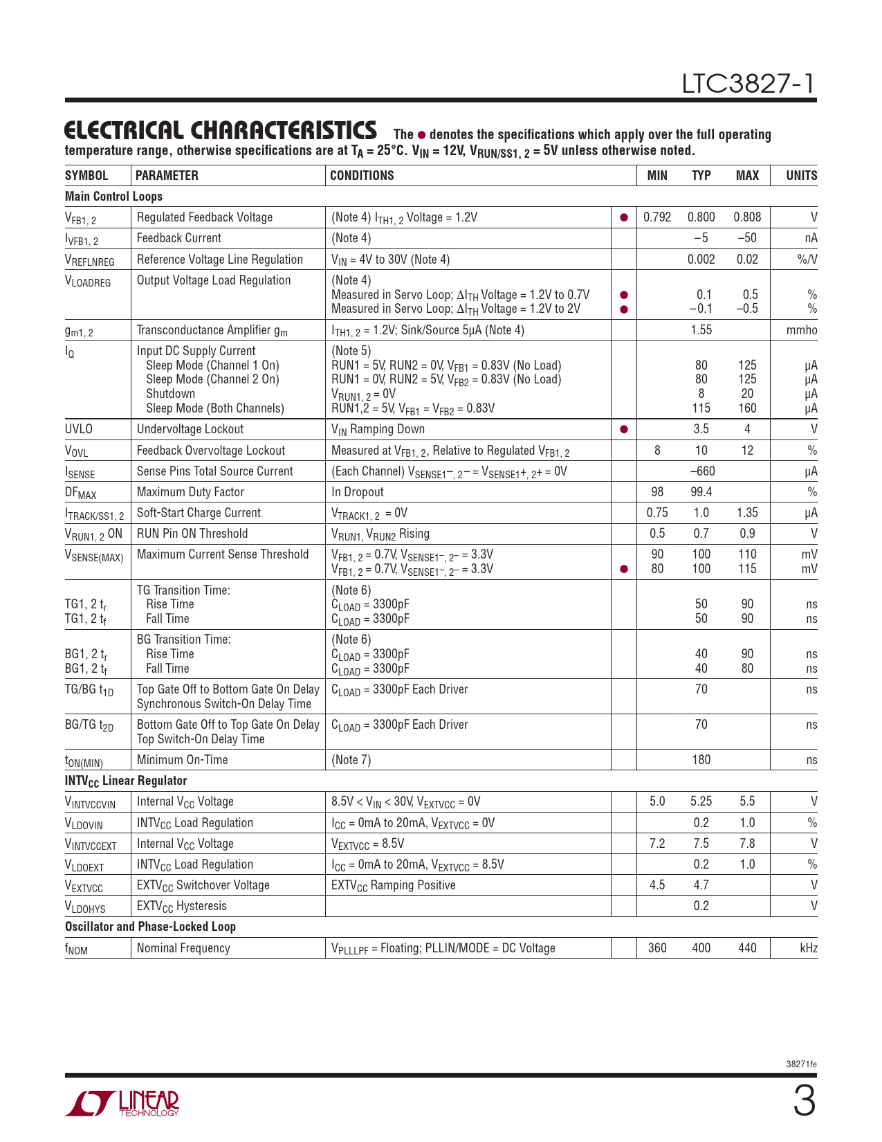 VFB1, 2 Regulated Feedback Voltage (Note 4) ITH1, 2 Voltage = 1.2V ● 0.792 0.800 0.808 V IVFB1, 2 Feedback Current (Note 4) – 5 –50 nA VREFLNREG Reference Voltage Line Regulation VIN = 4V to 30V (Note 4) 0.002 0.02 %/V VLOADREG Output Voltage Load Regulation (Note 4) Measured in Servo Loop; ΔITH Voltage = 1.2V to 0.7V ● 0.1 0.5 % Measured in Servo Loop; ΔITH Voltage = 1.2V to 2V ● – 0.1 –0.5 % gm1, 2 Transconductance Amplifi er gm ITH1, 2 = 1.2V; Sink/Source 5μA (Note 4) 1.55 mmho IQ Input DC Supply Current (Note 5) Sleep Mode (Channel 1 On) RUN1 = 5V, RUN2 = 0V, VFB1 = 0.83V (No Load) 80 125 μA Sleep Mode (Channel 2 On) RUN1 = 0V, RUN2 = 5V, VFB2 = 0.83V (No Load) 80 125 μA Shutdown VRUN1, 2 = 0V 8 20 μA Sleep Mode (Both Channels) RUN1,2 = 5V, VFB1 = VFB2 = 0.83V 115 160 μA UVLO Undervoltage Lockout VIN Ramping Down ● 3.5 4 V VOVL Feedback Overvoltage Lockout Measured at VFB1, 2, Relative to Regulated VFB1, 2 8 10 12 % ISENSE Sense Pins Total Source Current (Each Channel) VSENSE1–, 2– = VSENSE1+, 2+ = 0V –660 μA DFMAX Maximum Duty Factor In Dropout 98 99.4 % ITRACK/SS1, 2 Soft-Start Charge Current VTRACK1, 2 = 0V 0.75 1.0 1.35 μA VRUN1, 2 ON RUN Pin ON Threshold VRUN1, VRUN2 Rising 0.5 0.7 0.9 V VSENSE(MAX) Maximum Current Sense Threshold VFB1, 2 = 0.7V, VSENSE1–, 2– = 3.3V 90 100 110 mV VFB1, 2 = 0.7V, VSENSE1–, 2– = 3.3V ● 80 100 115 mV TG Transition Time: (Note 6) TG1, 2 tr Rise Time CLOAD = 3300pF 50 90 ns TG1, 2 tf Fall Time CLOAD = 3300pF 50 90 ns BG Transition Time: (Note 6) BG1, 2 tr Rise Time CLOAD = 3300pF 40 90 ns BG1, 2 tf Fall Time CLOAD = 3300pF 40 80 ns TG/BG t1D Top Gate Off to Bottom Gate On Delay CLOAD = 3300pF Each Driver 70 ns Synchronous Switch-On Delay Time BG/TG t2D Bottom Gate Off to Top Gate On Delay CLOAD = 3300pF Each Driver 70 ns Top Switch-On Delay Time tON(MIN) Minimum On-Time (Note 7) 180 ns